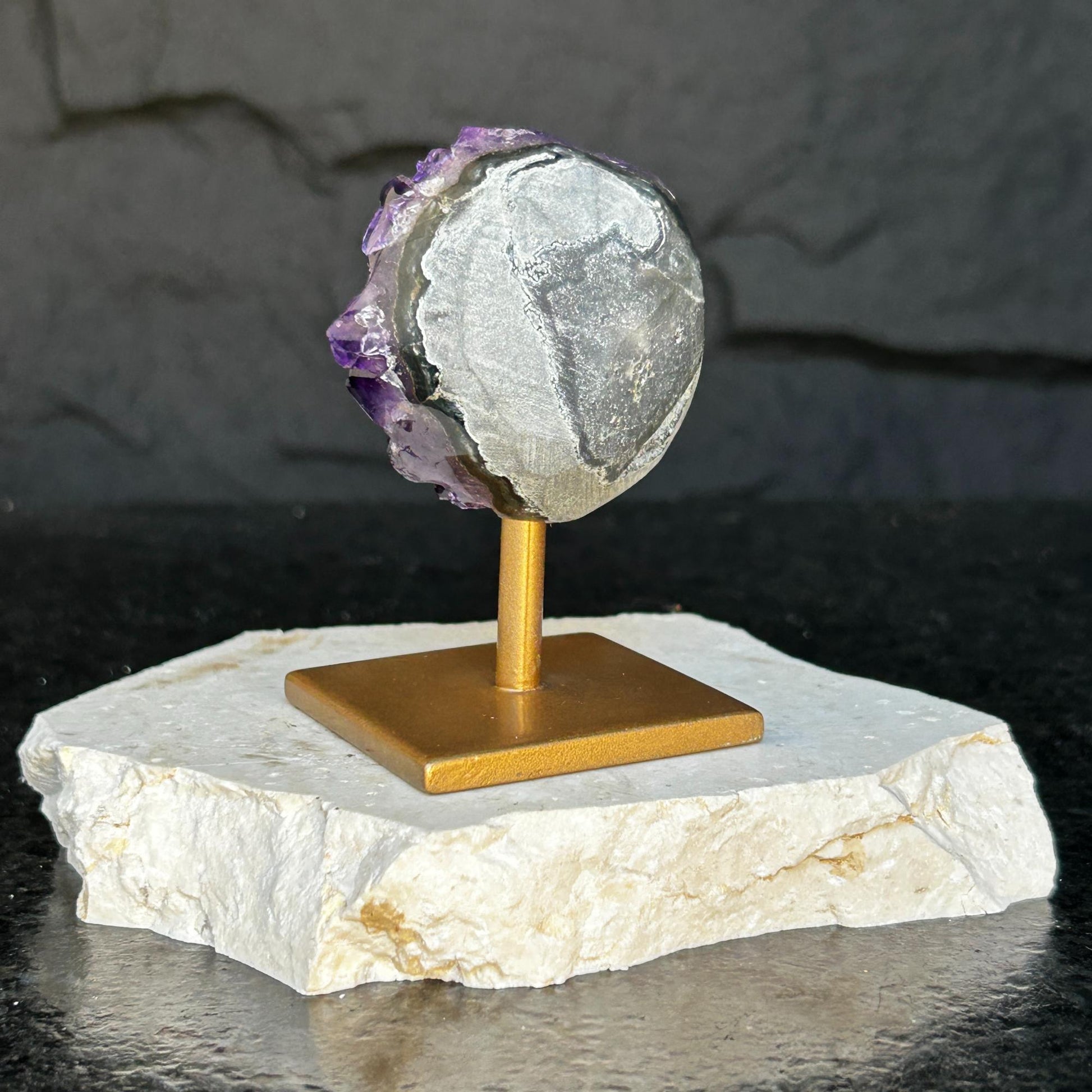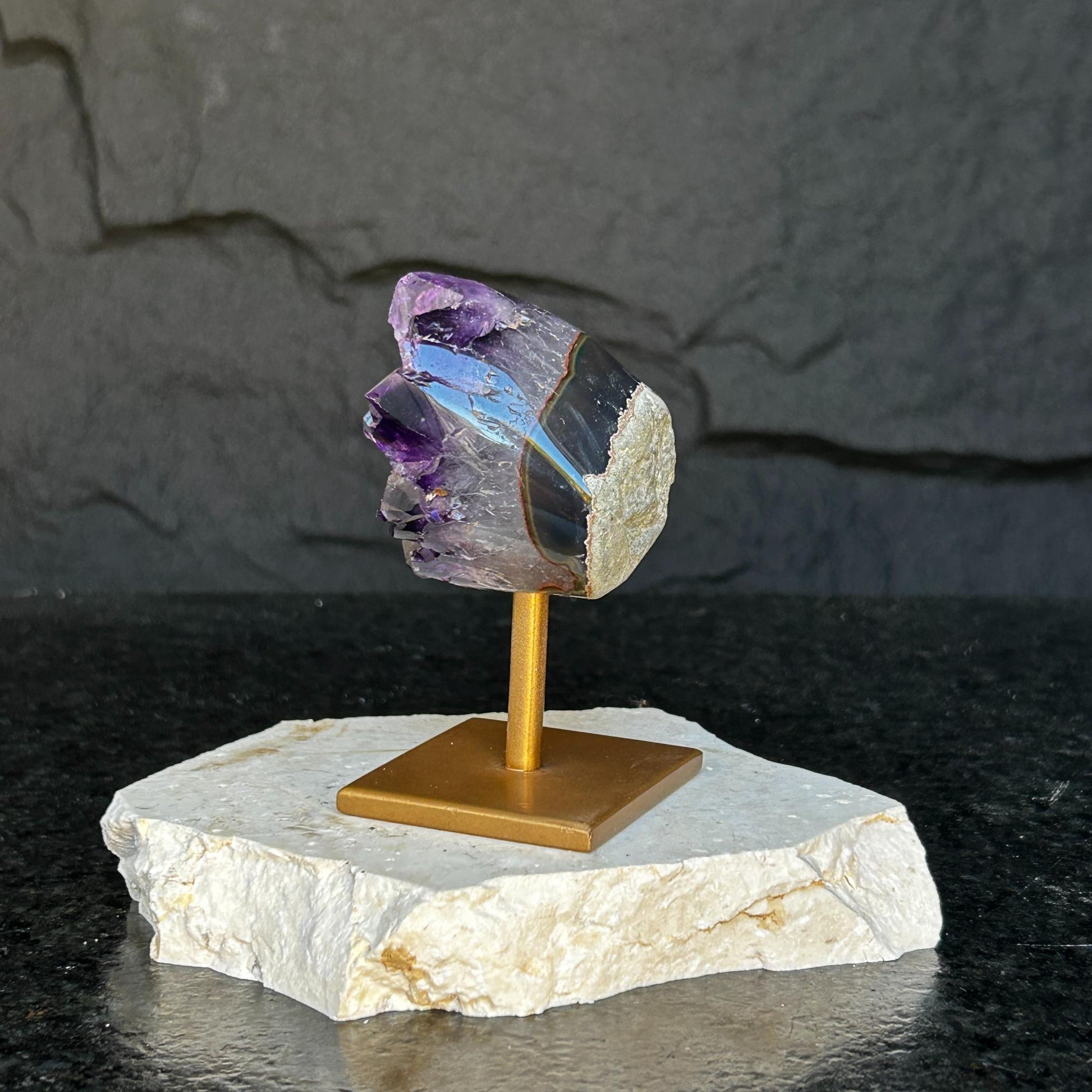 Amethyst on Stand SET, 4 in Crystals with metallic base, Unique home decoration, mineral formations, perfect gift for crystal lovers
