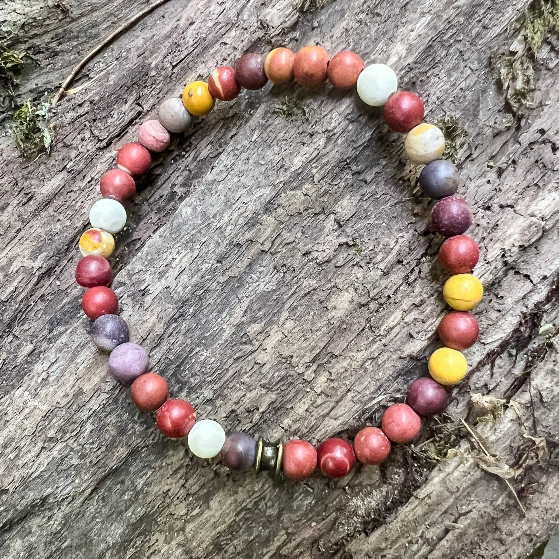 Made with 6mm matte Mookaite beads, each one carries a range of natural colors—mustard, deep red, soft cream, and golden brown—that echo dry grasses, ancient soil, and the colors of shifting seasons. The matte finish gives the stones a soft, earthy texture that feels grounded and timeless.