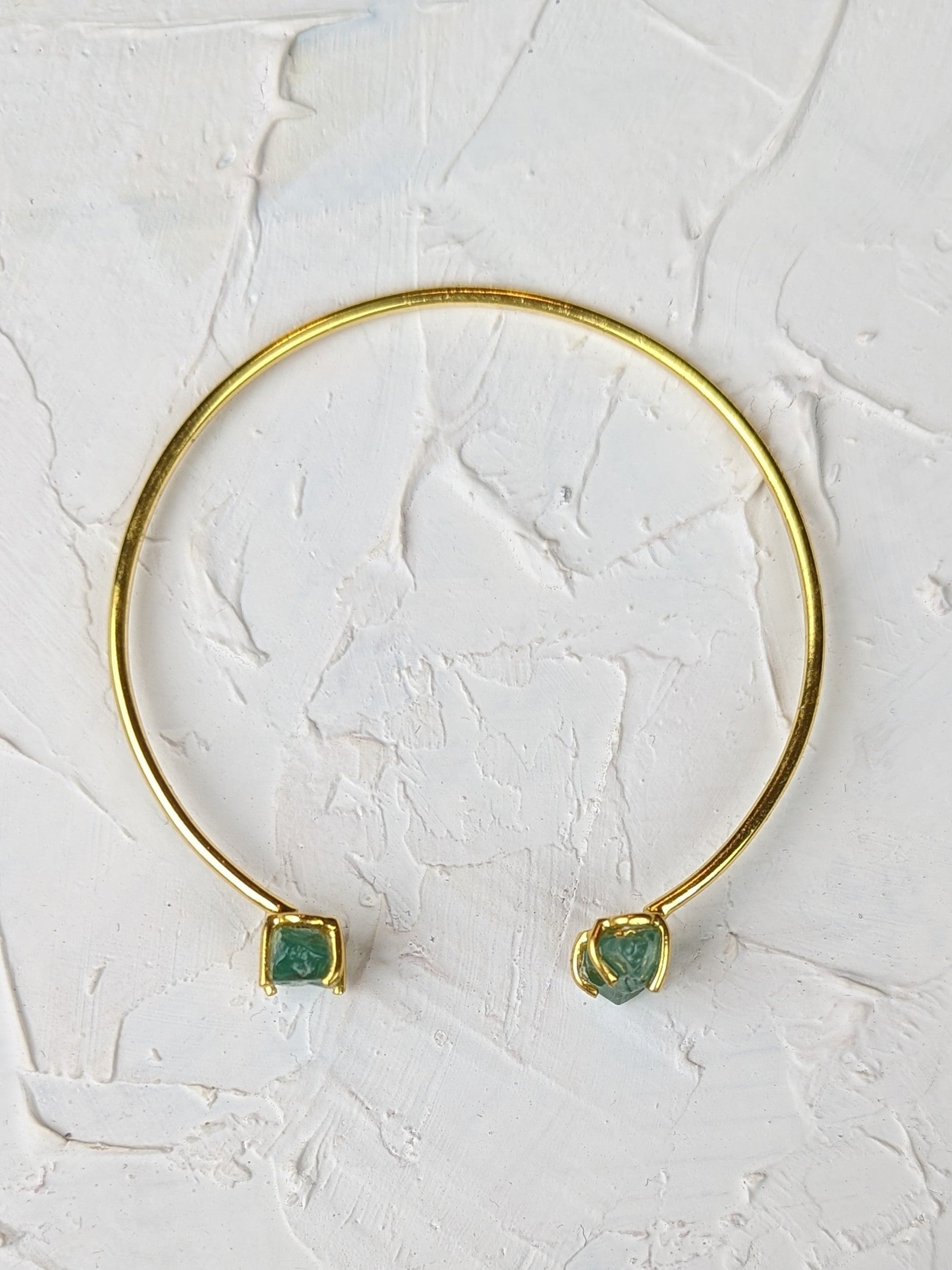 Beautiful, minimalistic gold cuff adorned with ocean-green raw apatite stones in a prong setting.