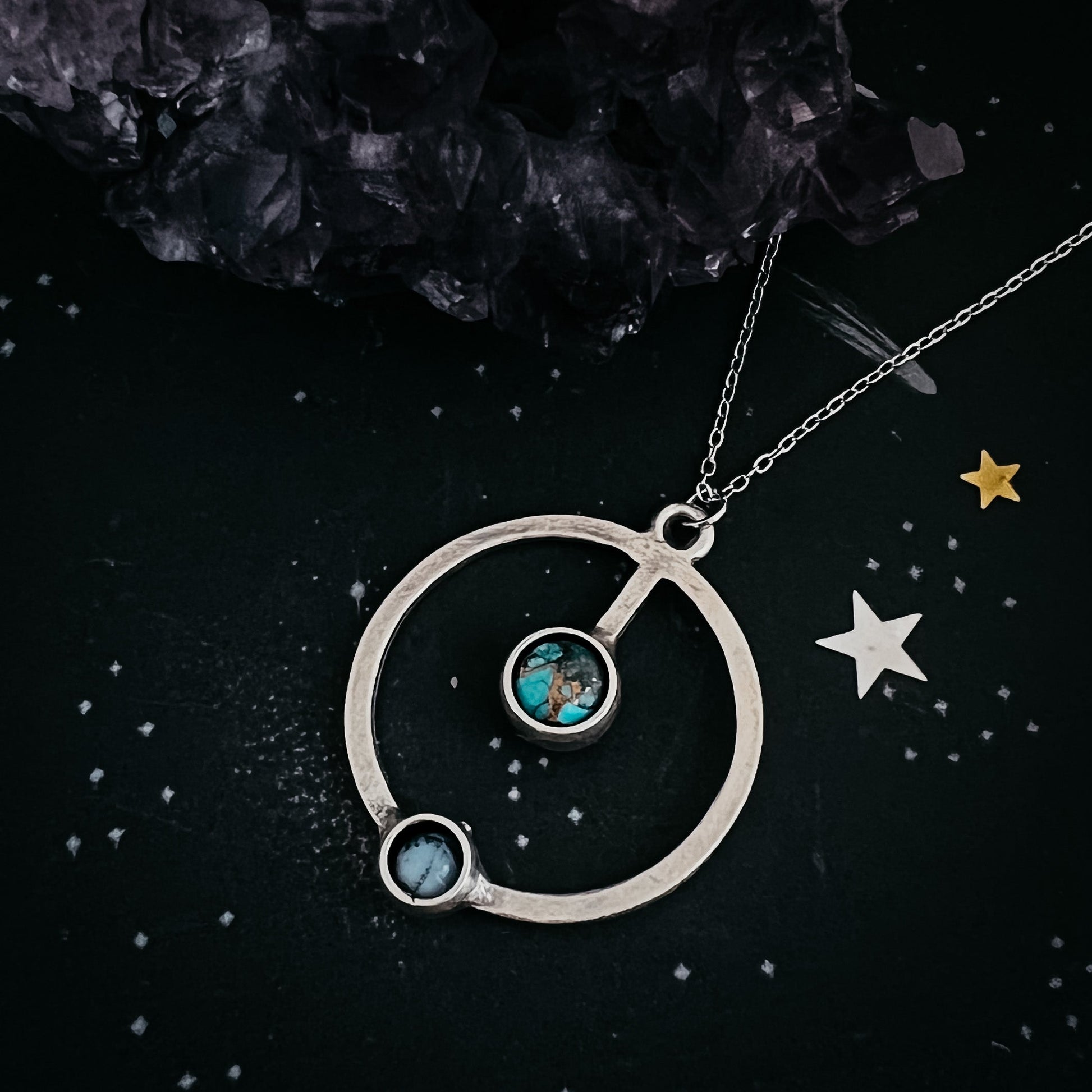 Be a part of history and celebrate our next mission to the Moon! This symbolic necklace is inspired by the Artemis mission, featuring a copper chrysocolla Earth being orbited by a dendrite Moon. We are going! Will you be part of it?