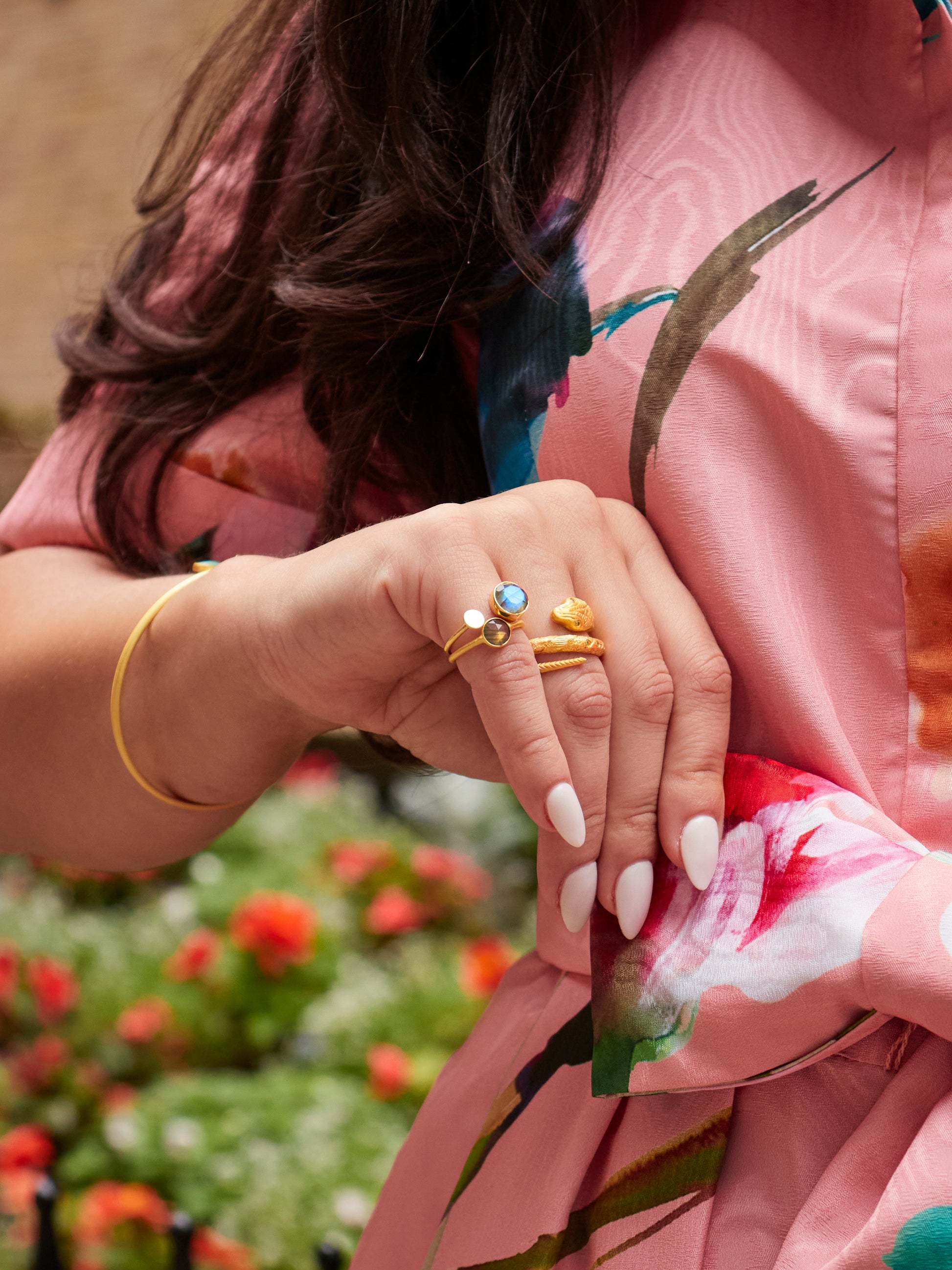 Our golden cobra with her shiny eyes and markings is pretty charming. The wrap style is slightly adjustable, with a matte finish and subtle scale texture.