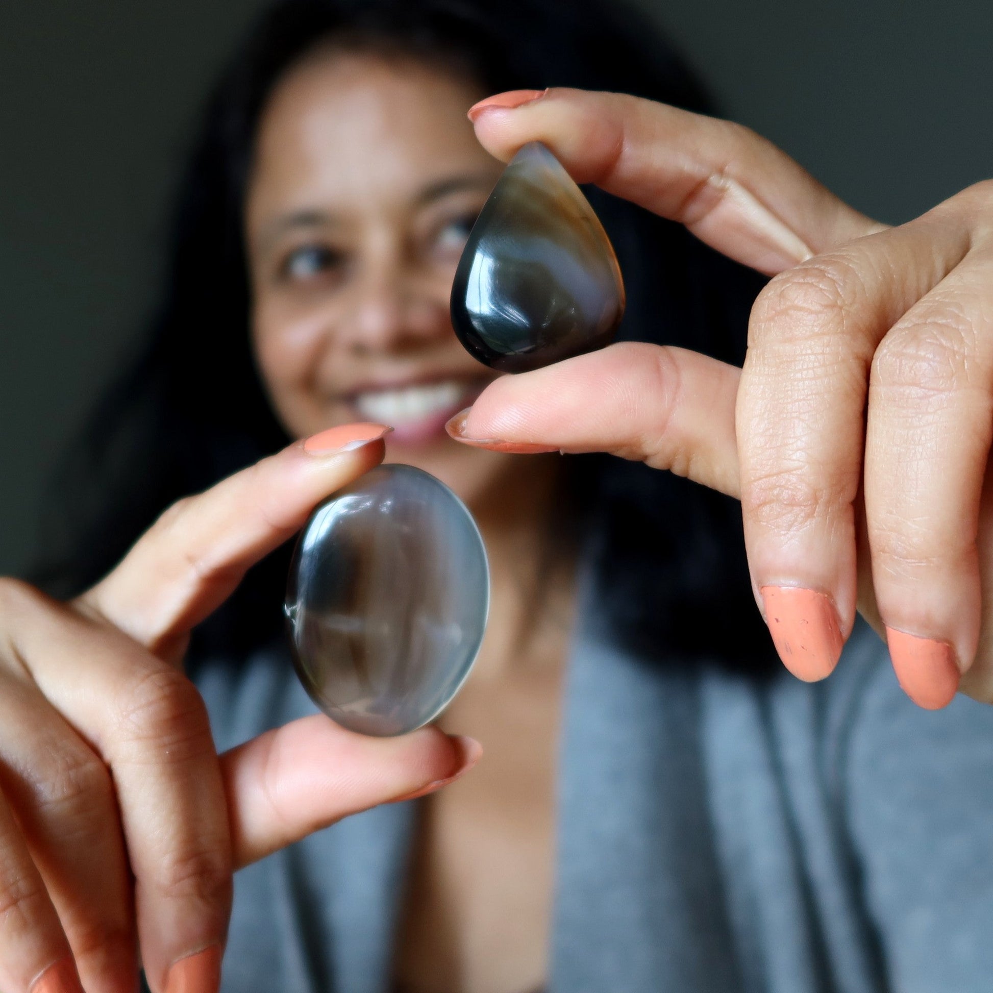Your 18 new stones are polished from natural Agate. The translucent, black, and brown banded stones vary in shape: oval, teardrop, marquise, circle, and freeform. Each stone is unique. You will receive the exact set as pictured.