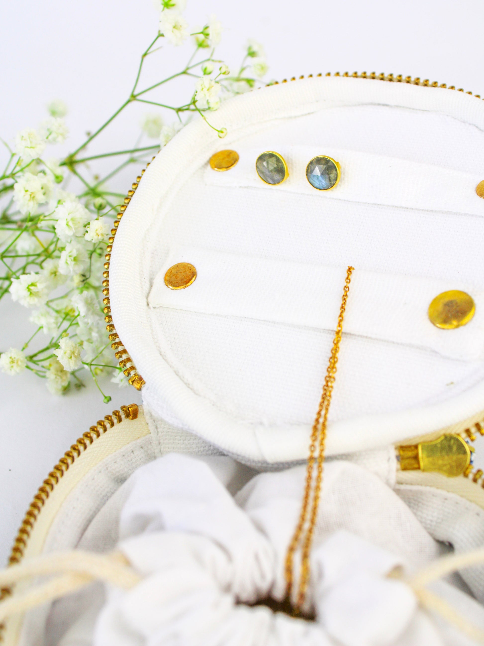 This round travel jewelry pouch is your go-to solution for keeping jewelry secure and organized on the move—or at home. Whether you’re headed on a weekend getaway or just want to declutter your dresser, this sweet little pouch makes elegant organization effortless.