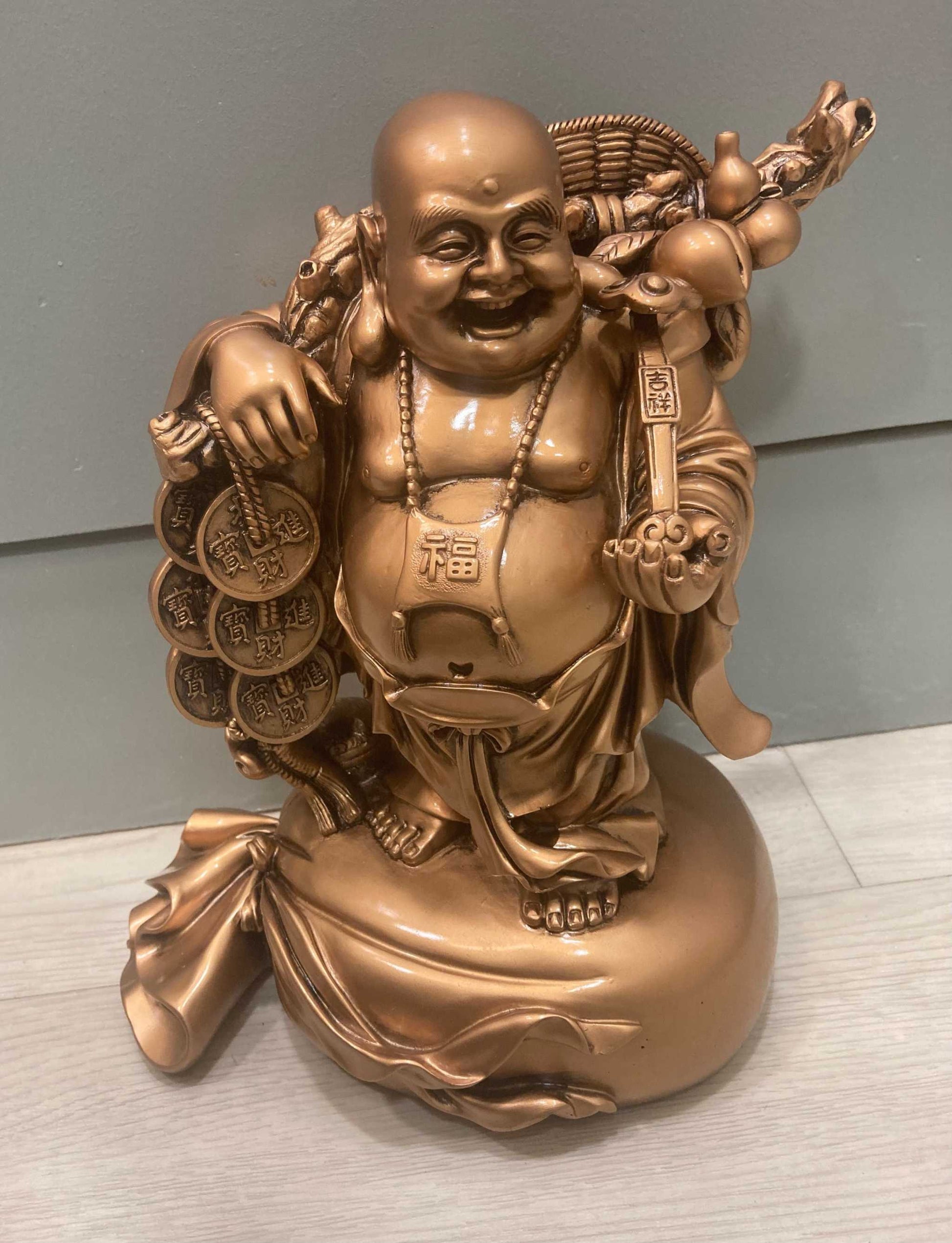 Often depicted in a seated or standing posture, the figure may hold symbolic items such as a sack (representing fulfillment of wishes), a wealth ball (symbolizing prosperity), or a string of prayer beads (indicating spiritual wisdom). The intricate detailing of the bronze finish adds depth to features like his jovial expression, folds of his robes, and smooth texture of his belly.