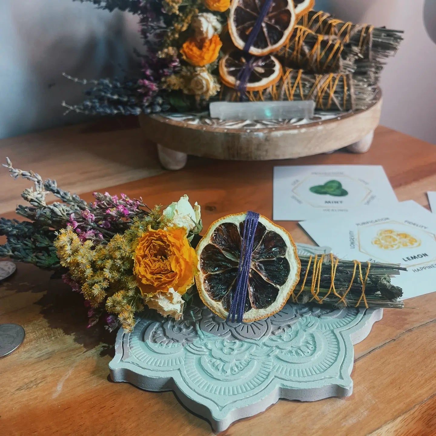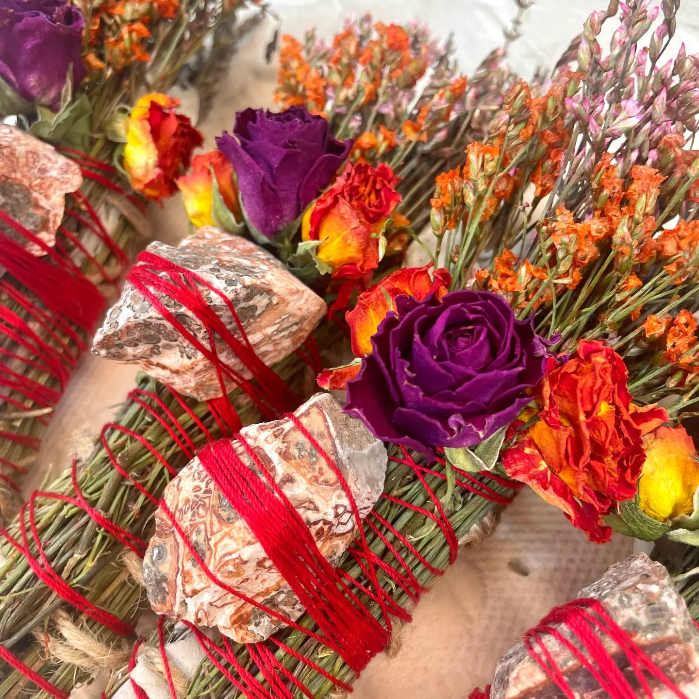 Intricately designed smudge bouquets from Charlie Haze! These bouquets are functional works of art made by hand with wildflowers, crystals, fruit and more.