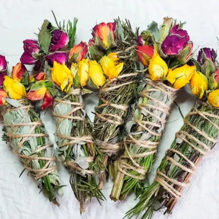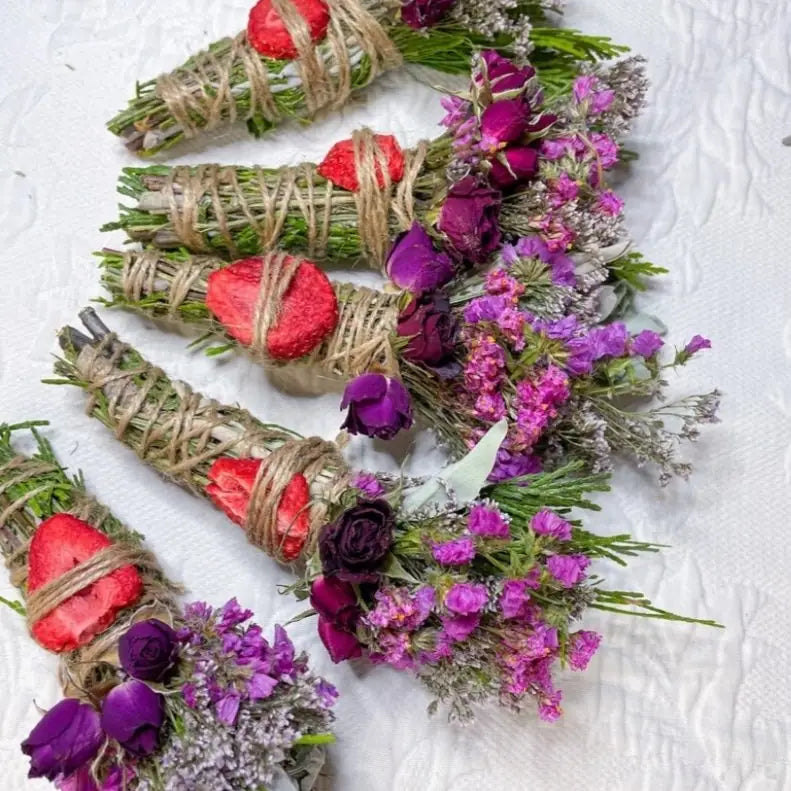 Use for space clearings, setting intentions, sending blessings, etc. Please note that photos taken when fresh, but the smudge sticks will come dried. Flowers may vary slightly due to seasonality. Includes one smudge stick.