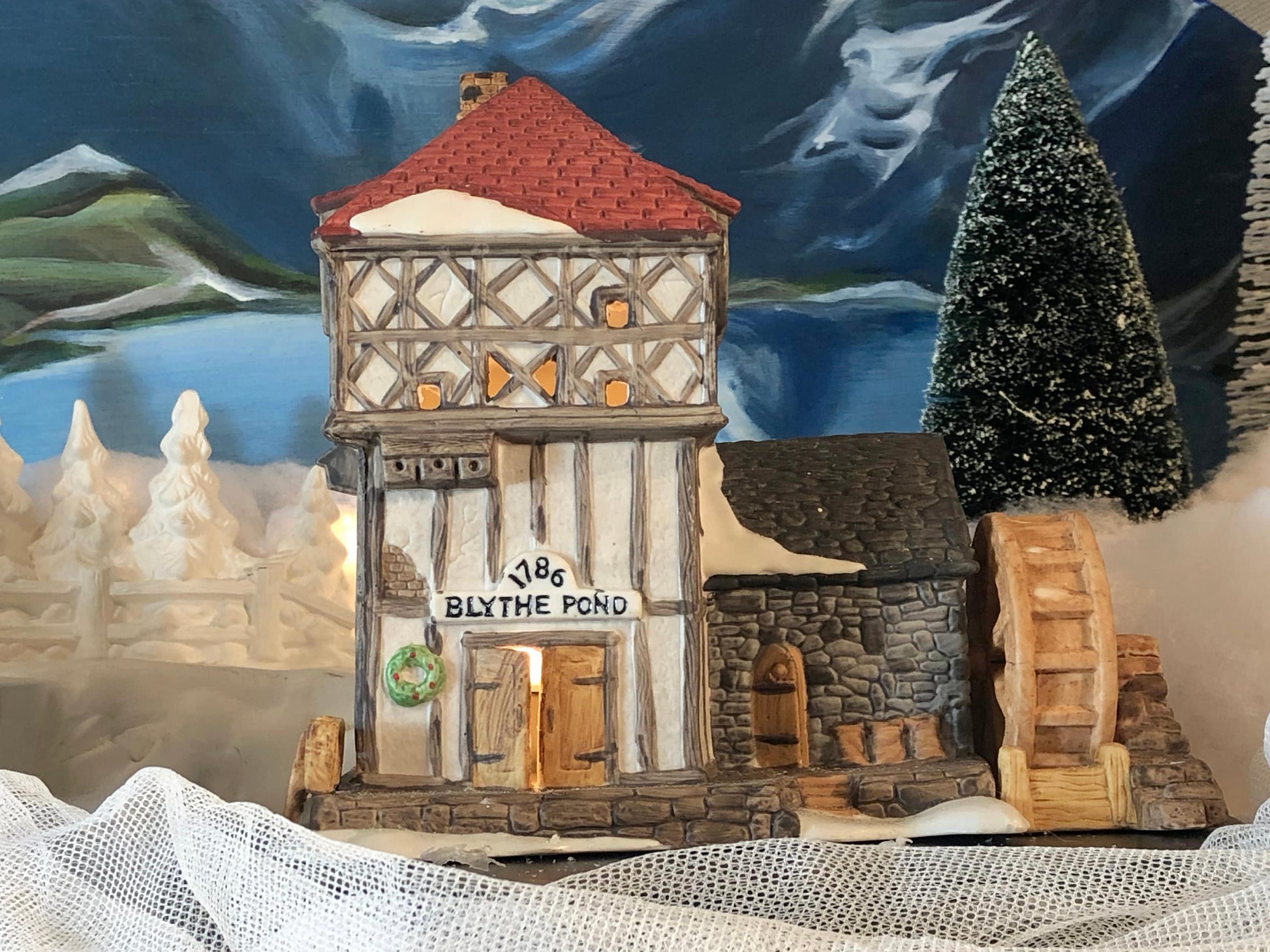 Christmas Village House Department 56 Blythe Pond 1786 Water Mill. Hand Painted Porcelain Building with Lights. It has many beautiful details. Comes with a light kit. Excellent vintage condition. Marked by manufacturer at the bottom. Very good vintage condition. Trees and background shown in photos are for presentation only and are not included in the price.