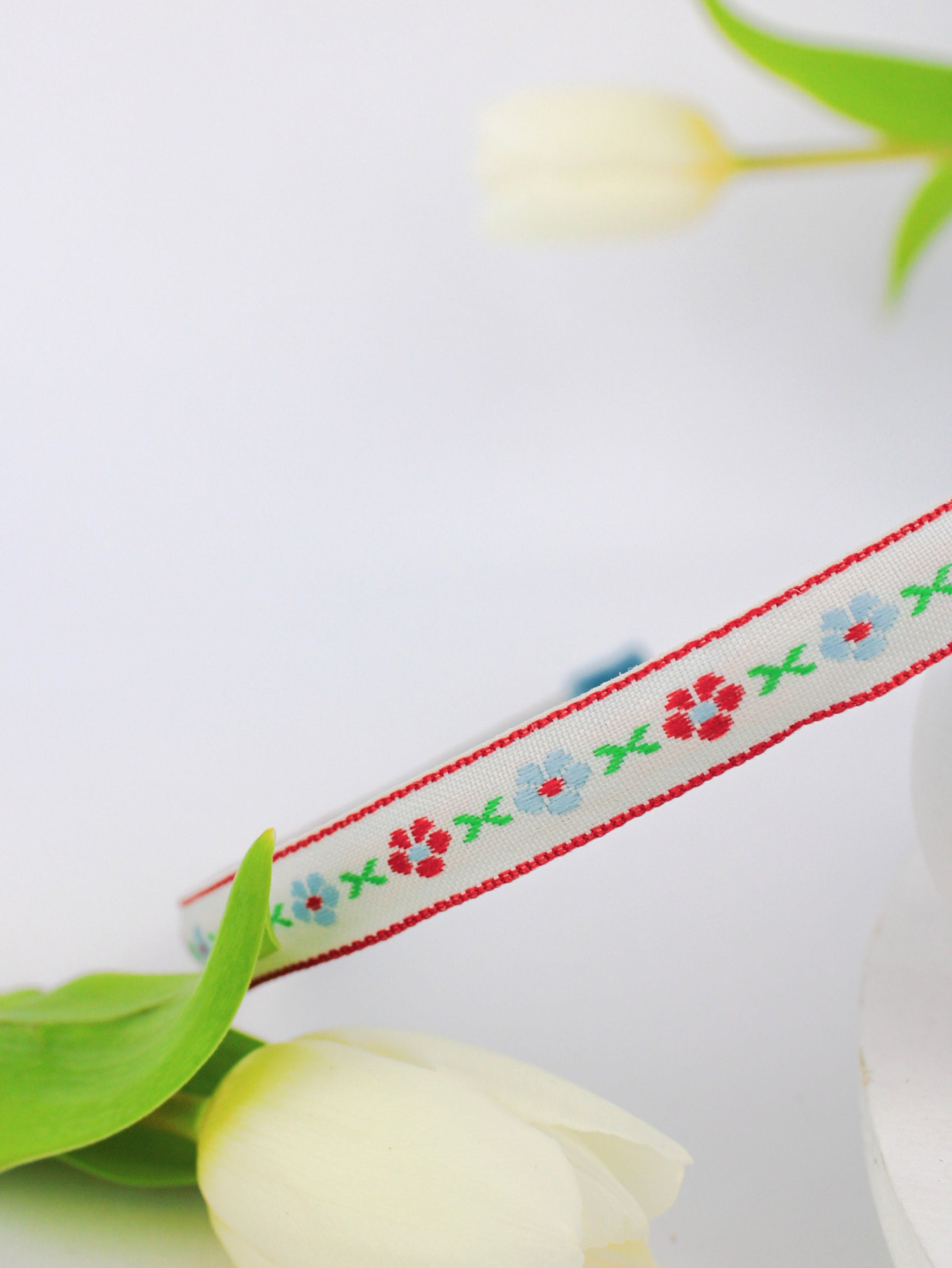 This limited-edition floral headband is made from embroidered vintage ribbon. The blue and copper with white are traditional Swedish and Danish choices. The ends are capped off with a soft blue velvet. Use it alone or pair it with another headband.