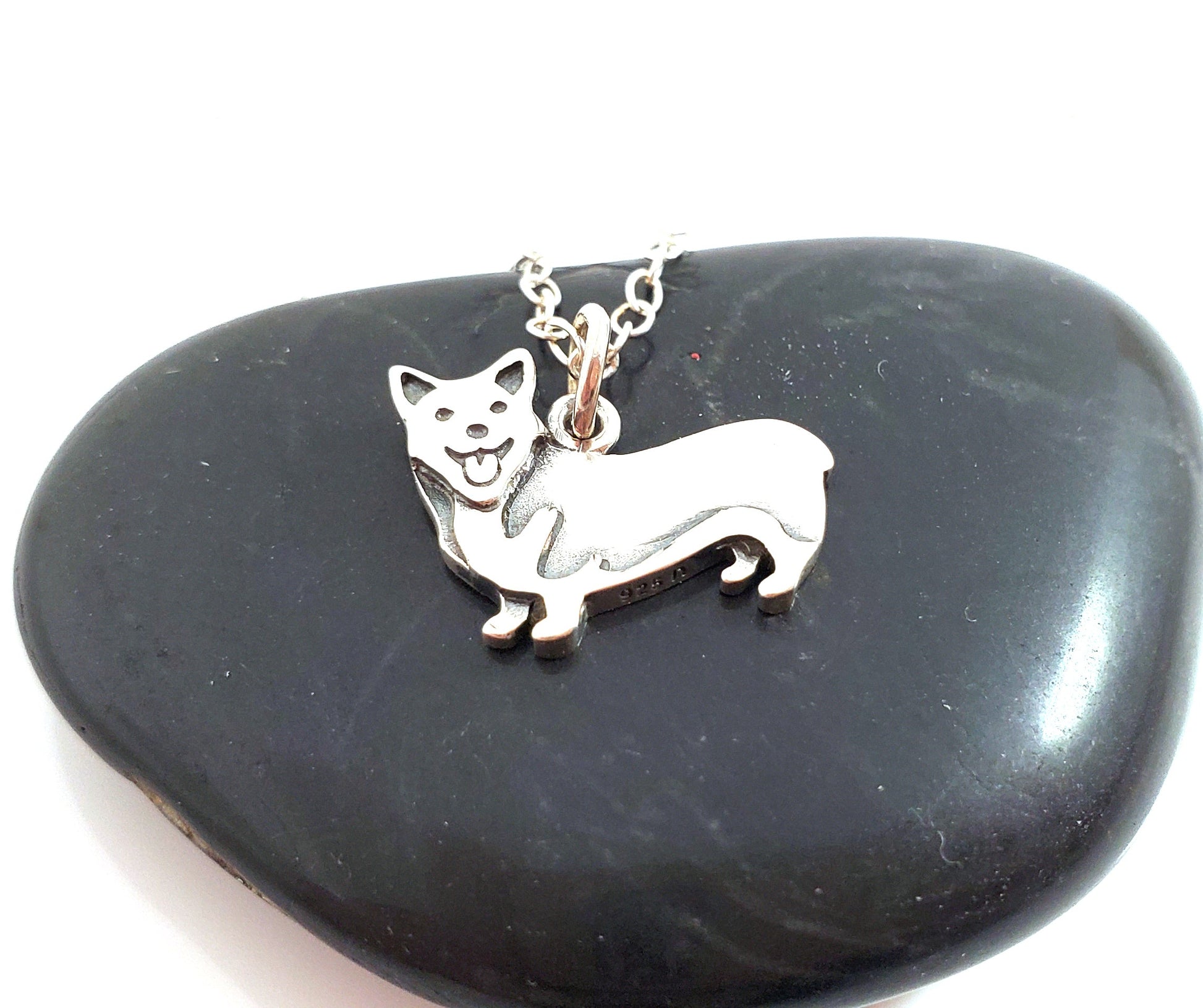 This dainty necklace is handcrafted featuring a an adorable Sterling Silver Corgi Charm attached to an 16 inch Sterling Silver cable chain with clasp. Necklace comes on a beautiful insert card, printed on high quality 110lb card stock.