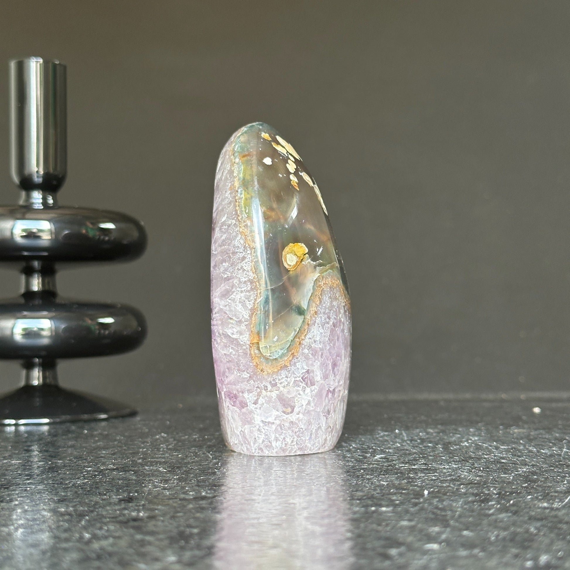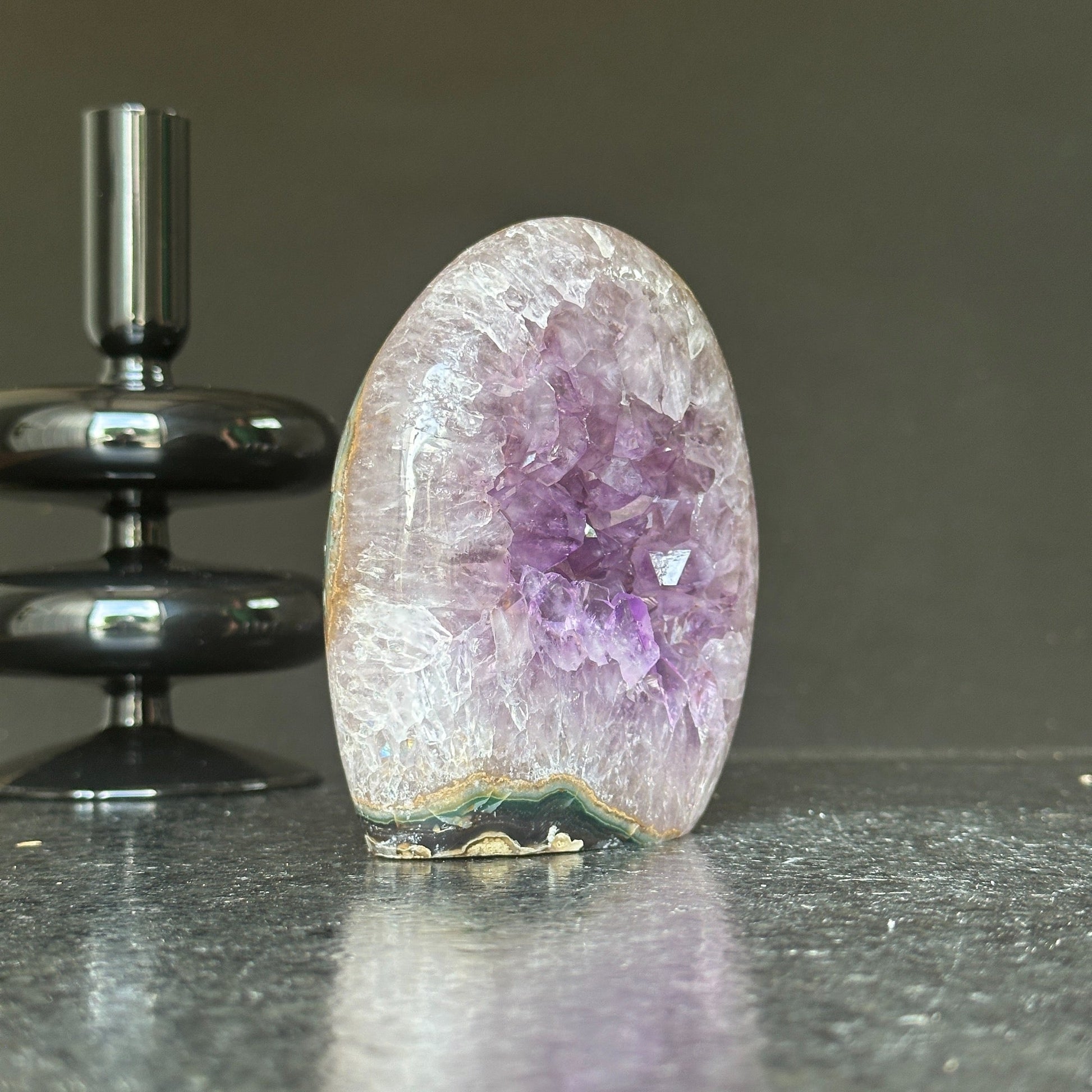 This crystal piece is made from natural amethyst from Uruguay. It was carefully polished at edges to show the wonderful jasper formations in shades of green.