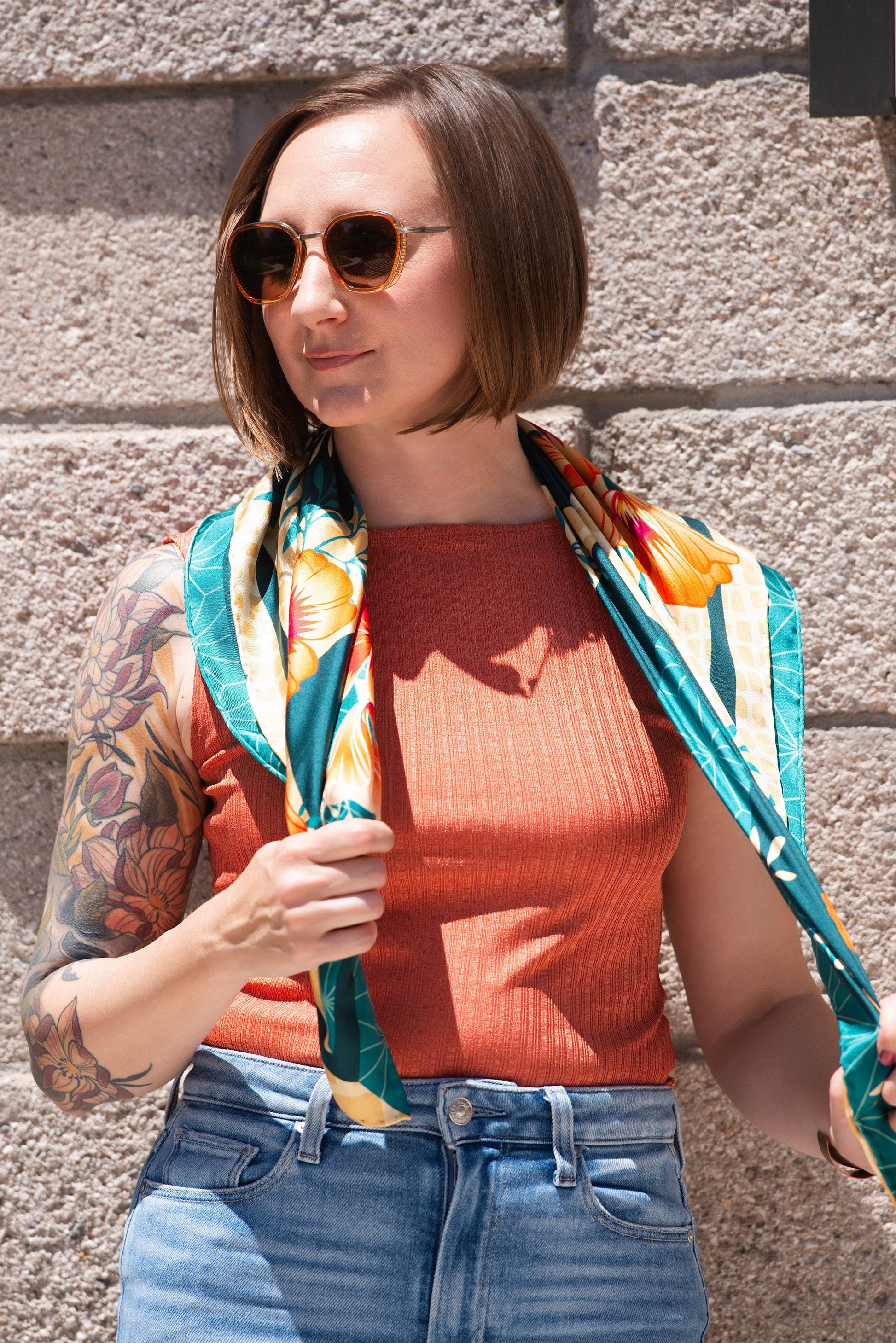 A rattlesnake weaves through, dividing the design and honoring the desert’s balance of Yin and Yang dualities: sun and shadow, surrender and victory. The snake symbolizes intuition and mystery; the flowers symbolize resilience and new beginnings.