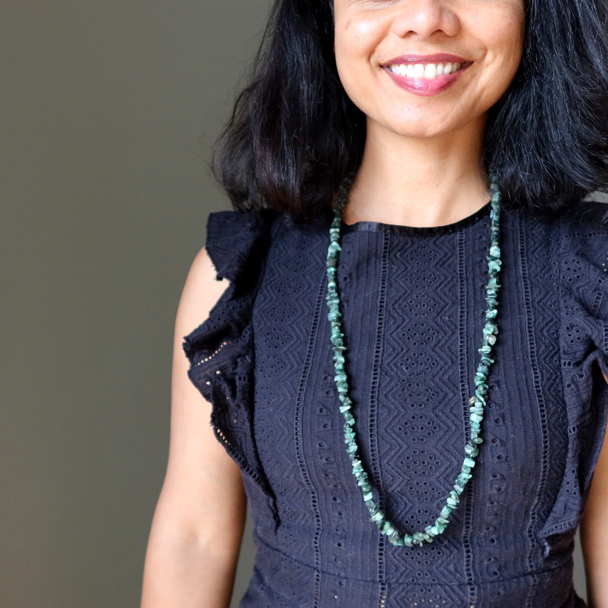 Show off your greatness with this lush strand of real Emeralds. The green gemstone necklace is long and elegant, perfect for enhancing your look and attire.