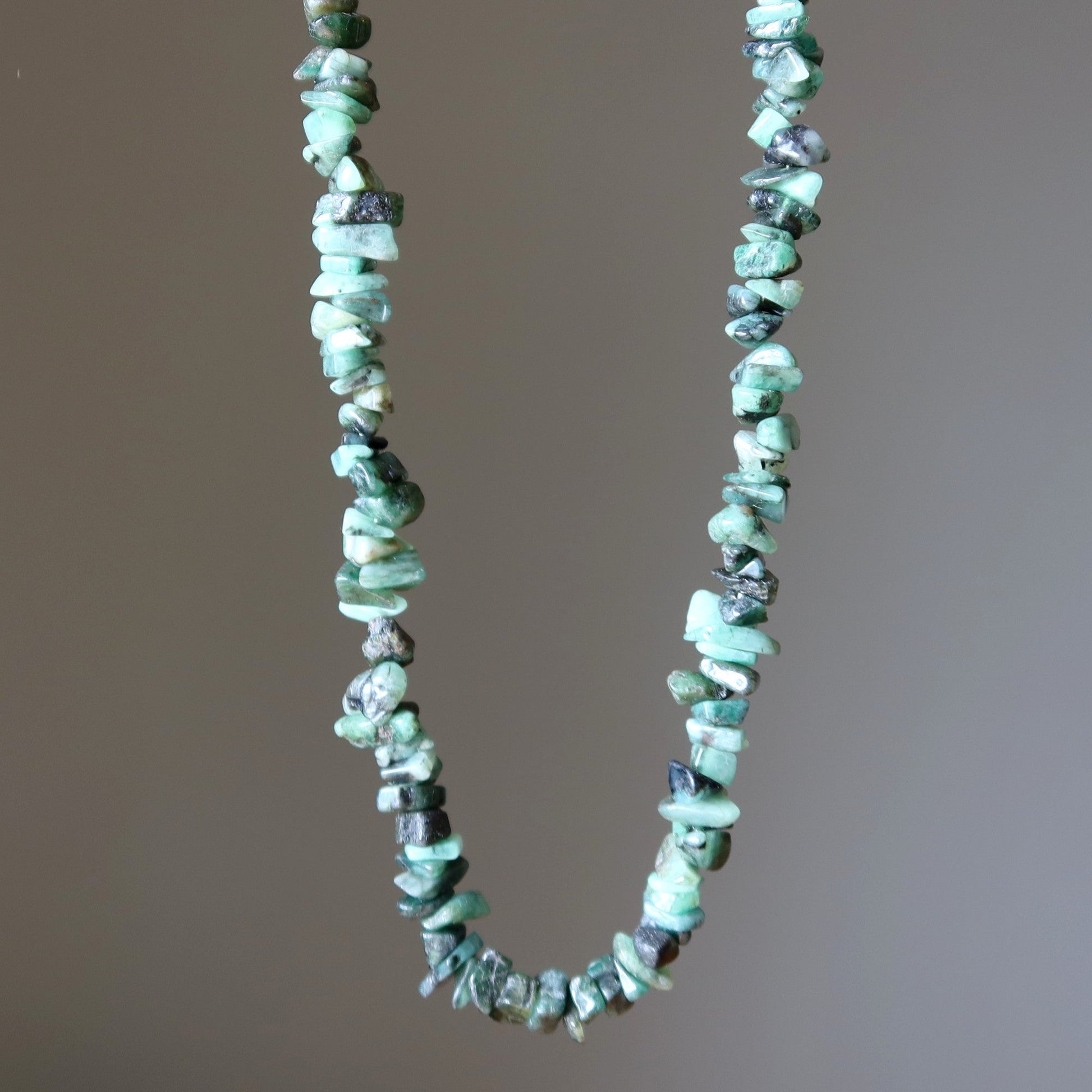 Your new necklace features natural and untreated Emeralds. These are green gemstones with black matrix. The nuggets are strung on a strand long enough to fit over your head without a clasp. Each stone is unique.