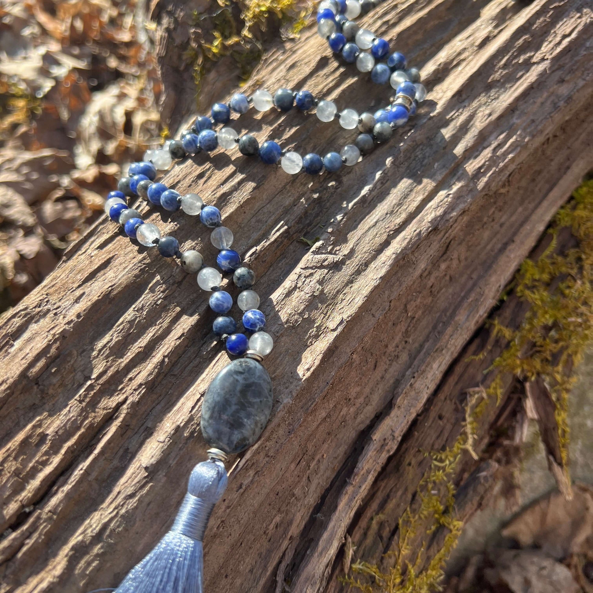 Emotional Balance Meditation Mala – 108 Beads of Sodalite & Larvikite
