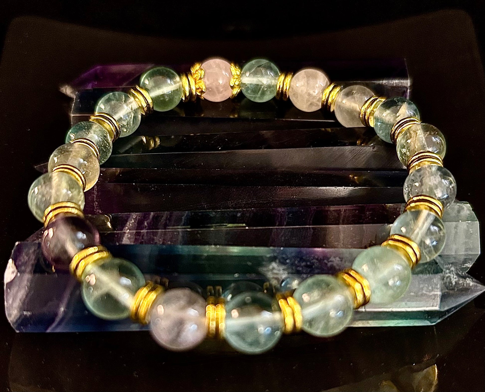 Gemstones: Rainbow Fluorite (clarity & protection) + Rose Quartz center (love & compassion)
