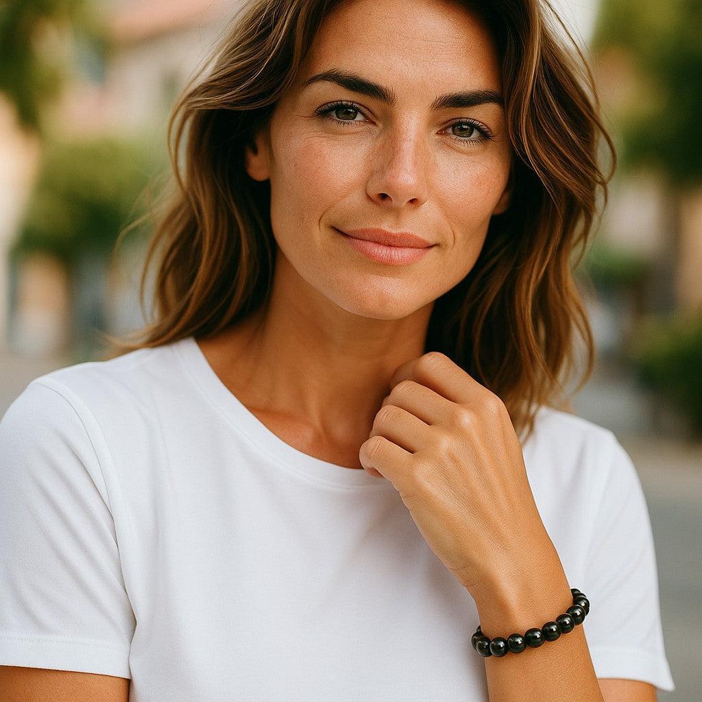 This Hematite Magnetic Beaded Bracelet features natural hematite stones with built-in magnetic properties, strung on a flexible elastic cord for a comfortable and stylish fit. Each bead showcases the stone’s metallic luster, creating a sleek and modern accessory.