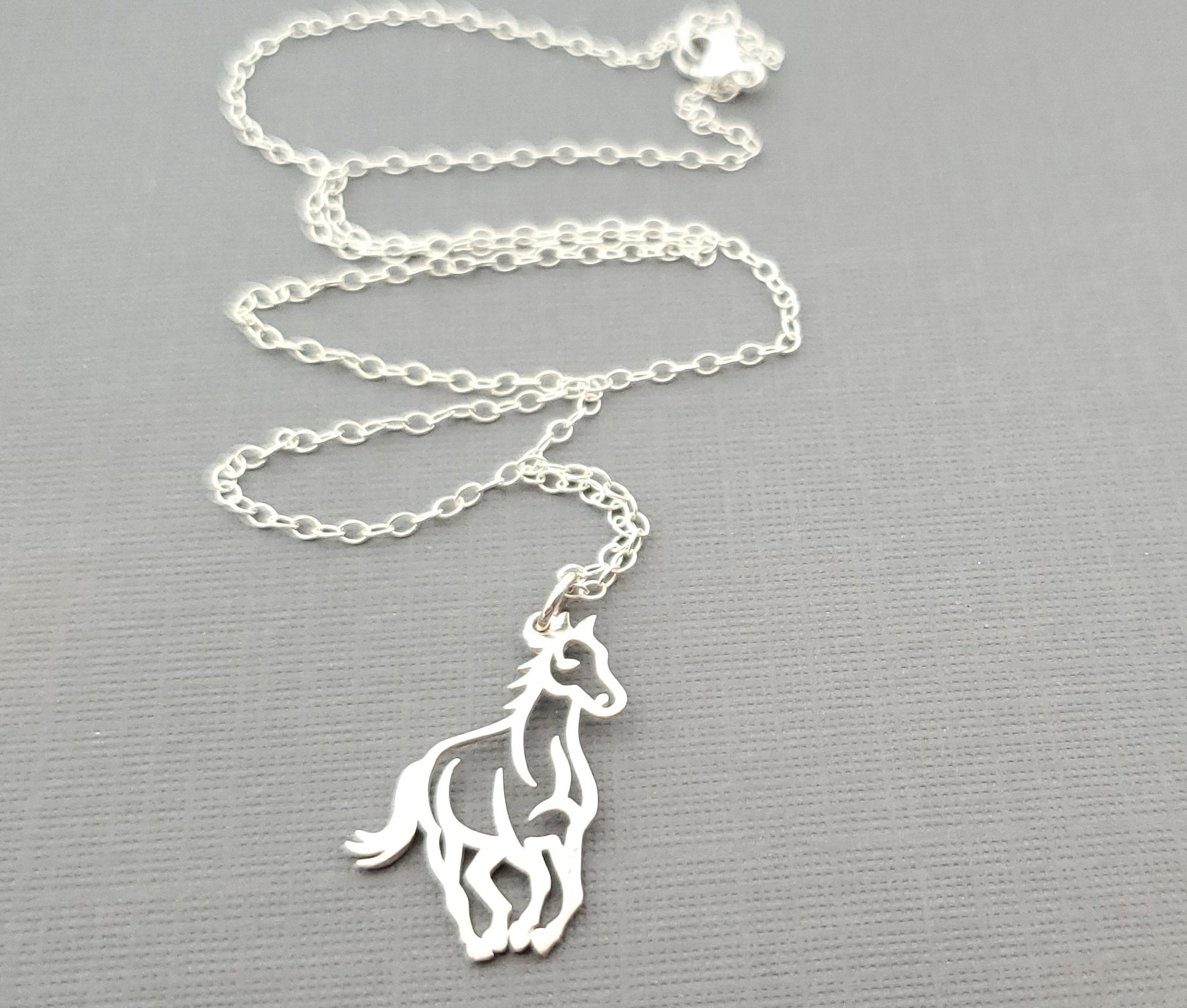 This dainty necklace is handcrafted featuring a detailed 925 sterling silver Horse charm. Attached to delicate 925 sterling silver chain, this necklace measures 18 inches long with secure spring ring closure.