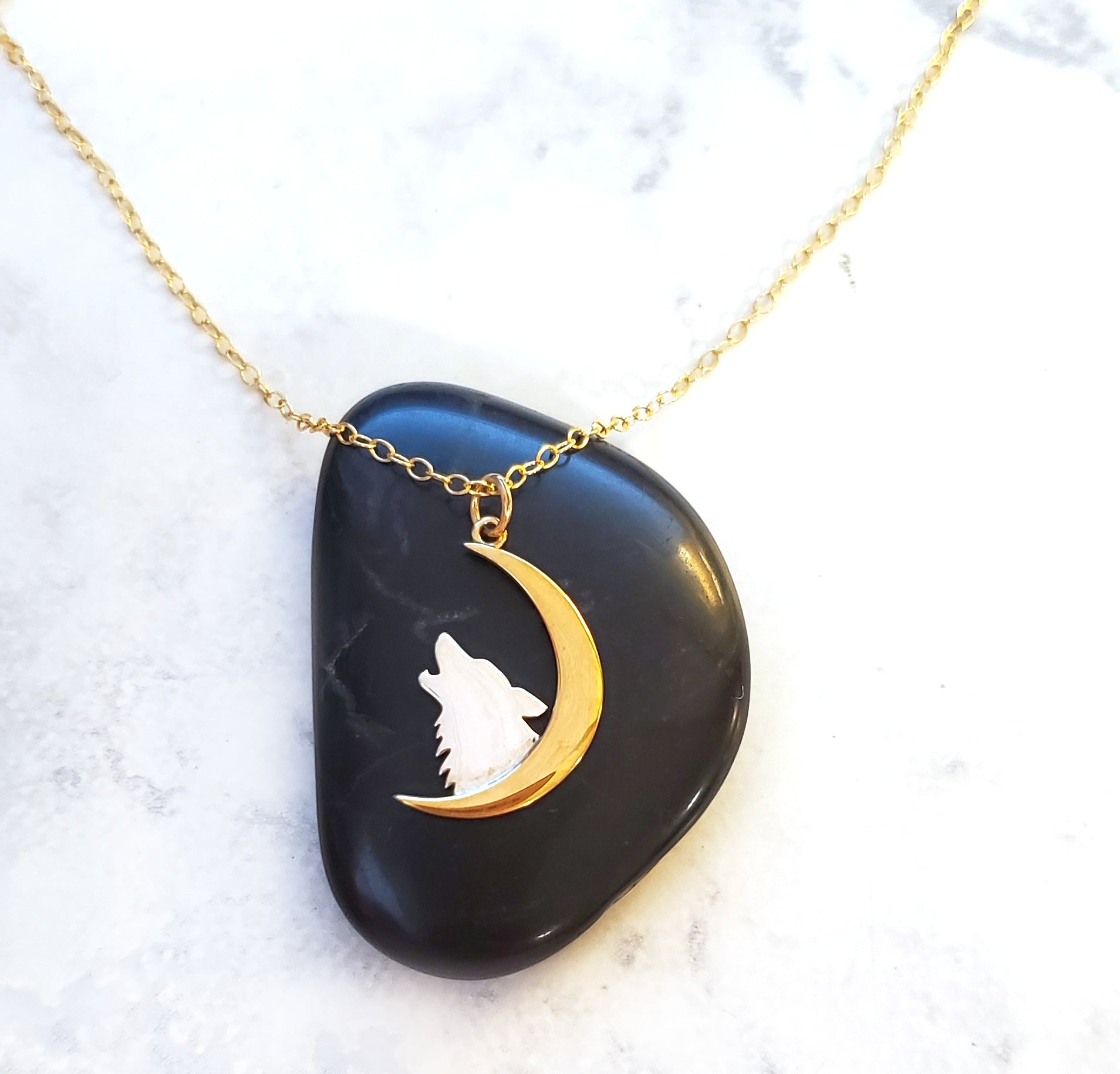 This dainty necklace is handcrafted featuring a detailed Howling Wolf and Moon charm attached to a delicate 18 inch, 14k Gold Filled cable chain with secure lobster clasp. Necklace comes on a beautiful insert card, printed on high quality 110lb card stock.