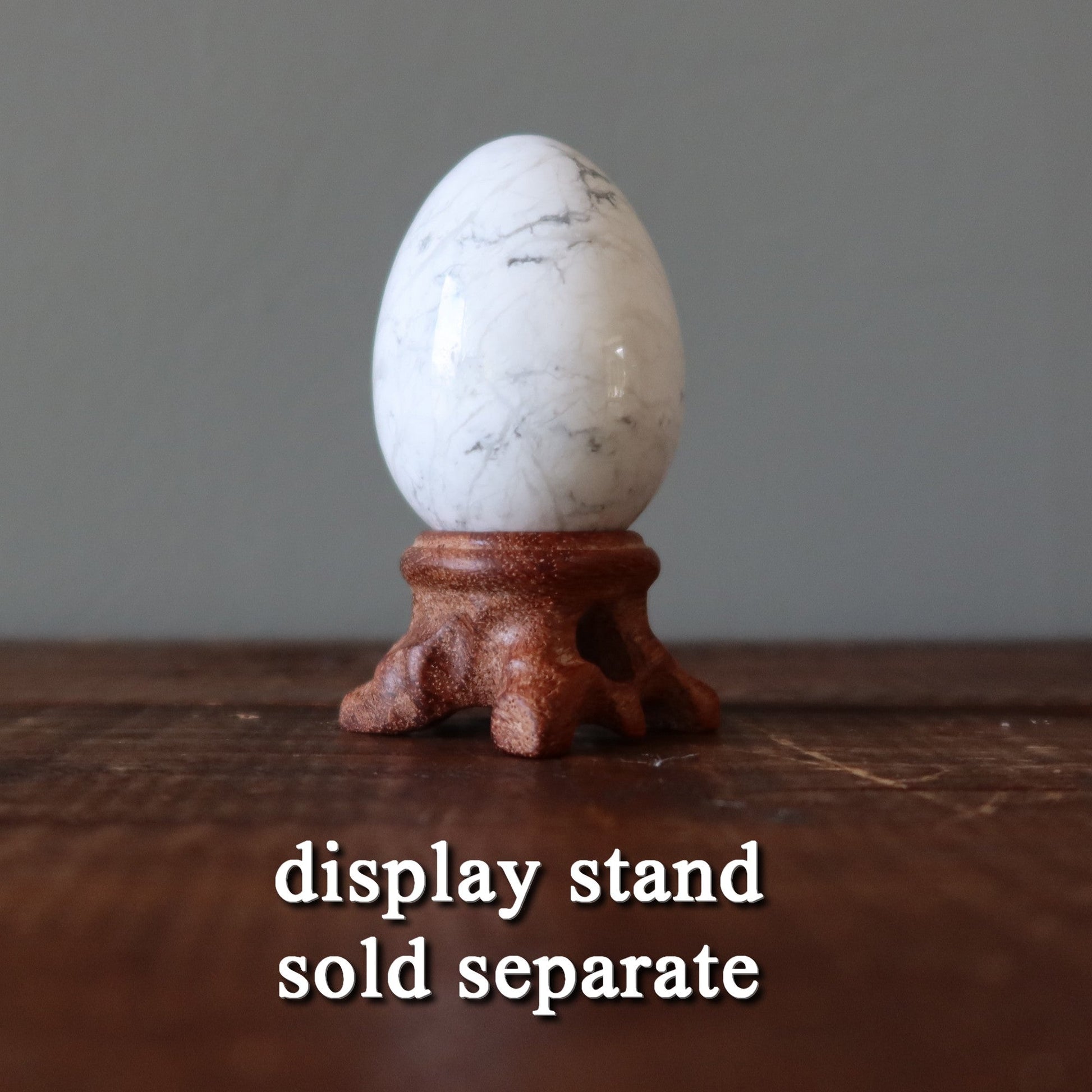 Your crystal egg features natural and untreated Howlite. This is a white stone with gray veins. Each egg differs.