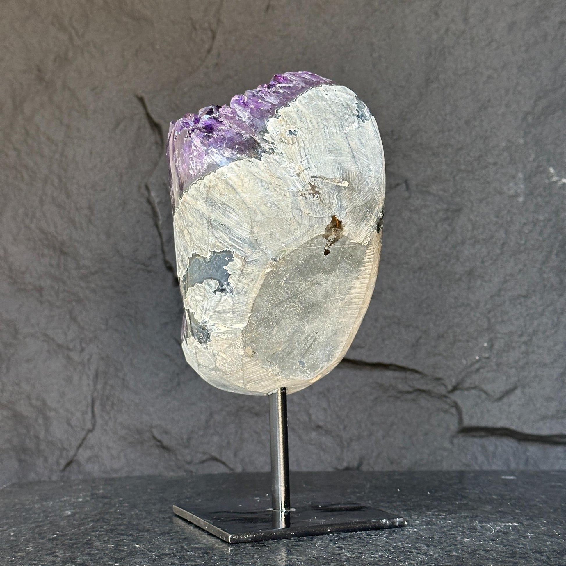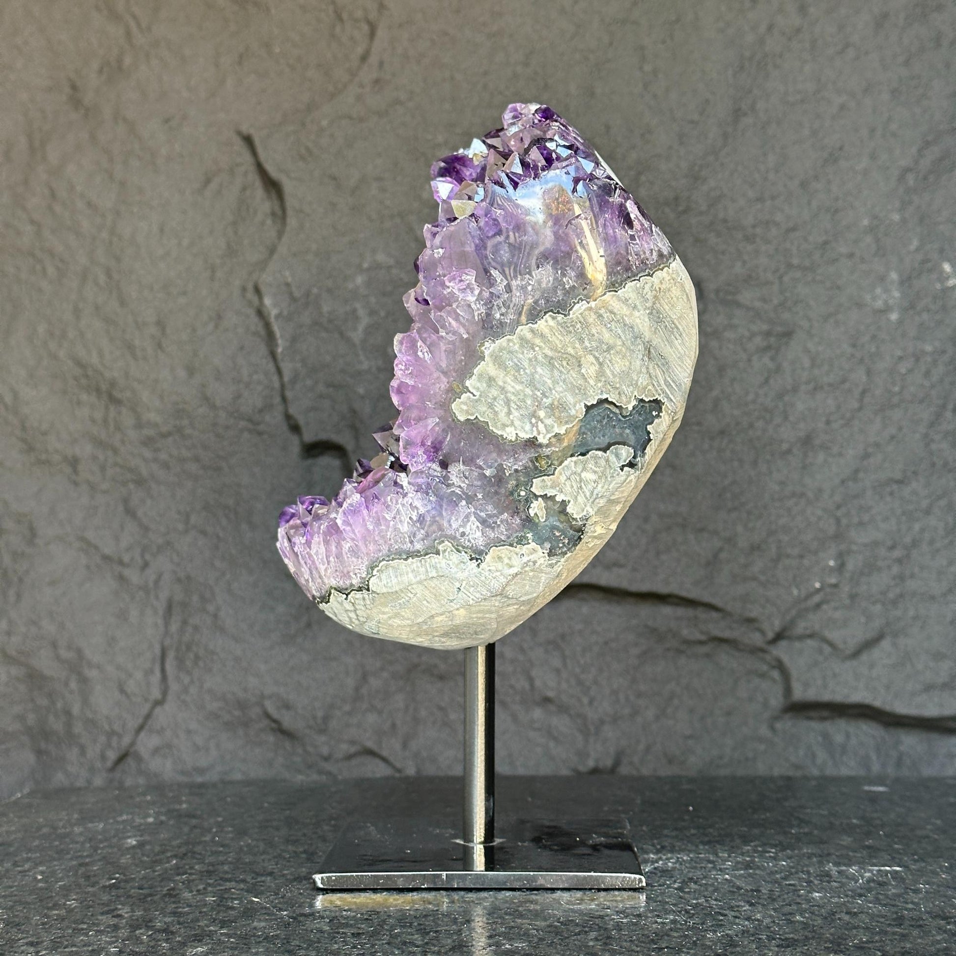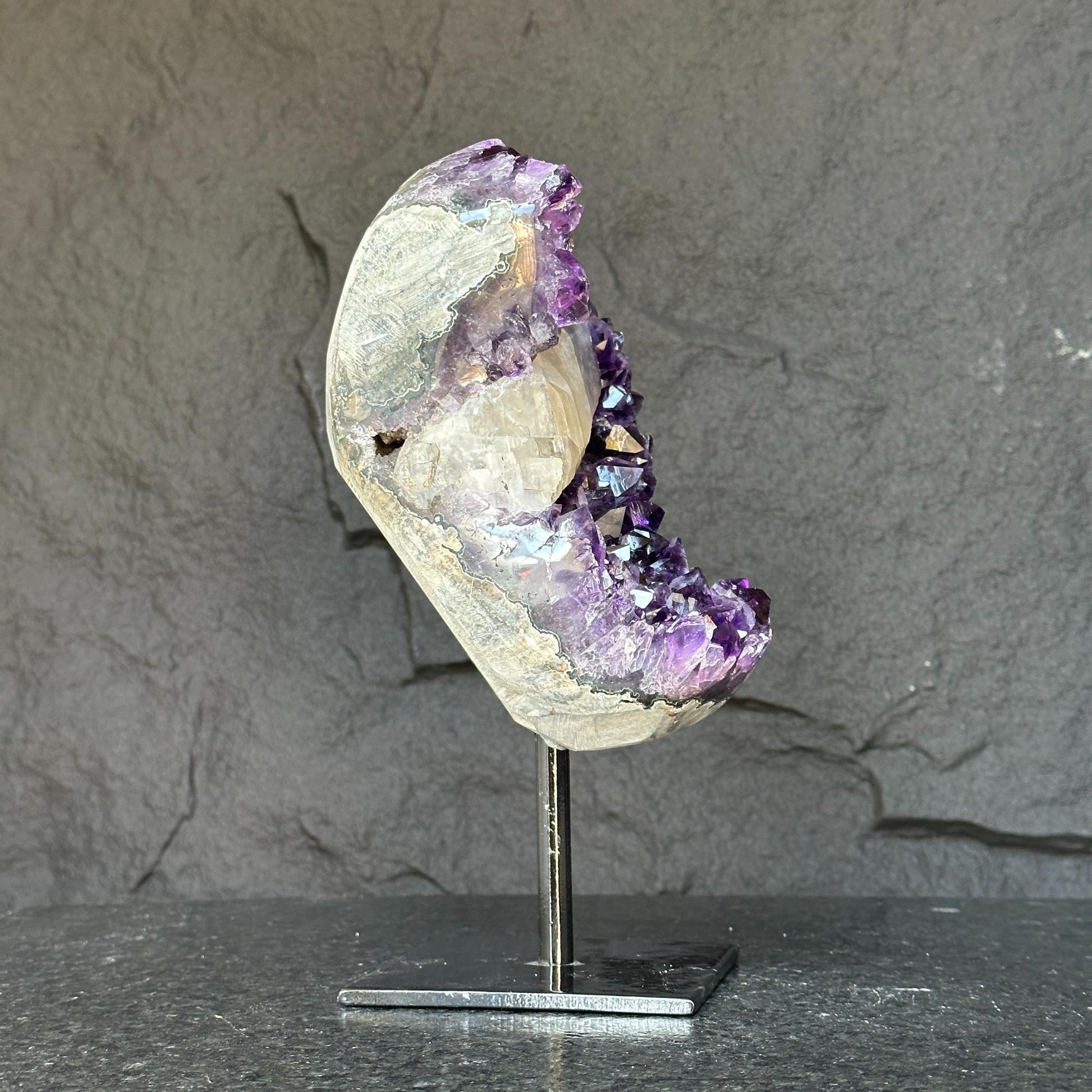 This crystal piece is made from natural amethyst stone from Uruguay. It was carefully polished at the edges to show the wonderful agate formations, in shades of beige.