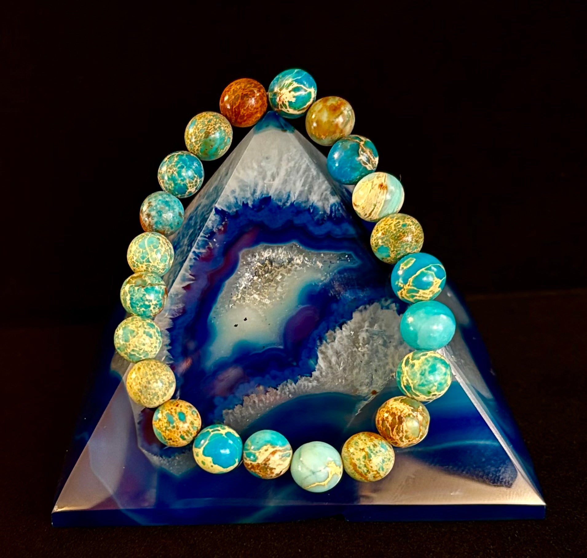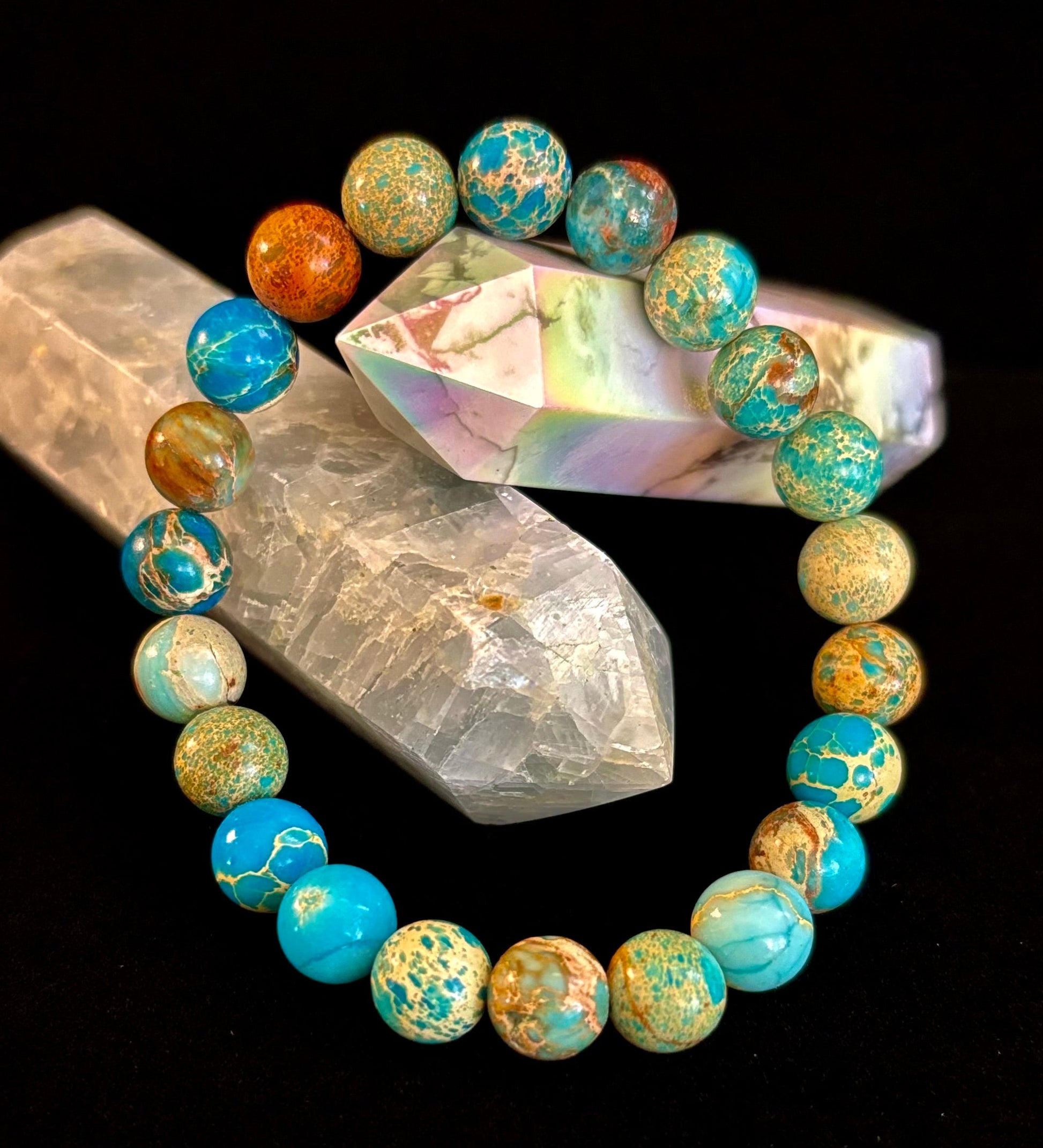 Channel grounding energy with style and grace in our Imperial Jasper Gemstone Bracelet, featuring mesmerizing swirls of soft sky blue, earthy taupe, and rich terracotta red. Handcrafted with polished 8mm natural stones, this stretch bracelet offers both emotional balance and a bold, artistic vibe.