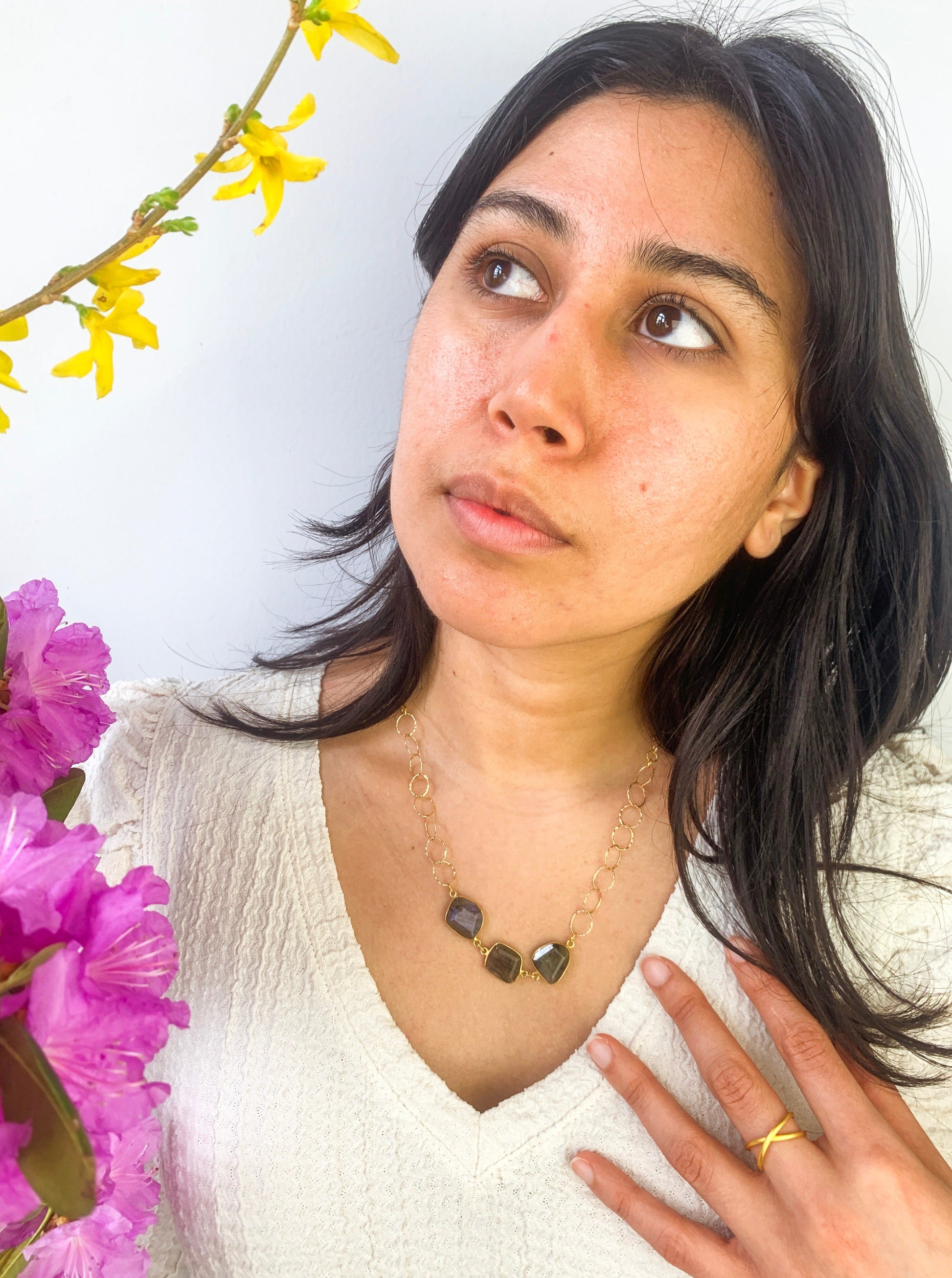 Each necklace features a trio of rounded bezel-set labradorite stones that will closely resemble but not exactly match what's pictured.