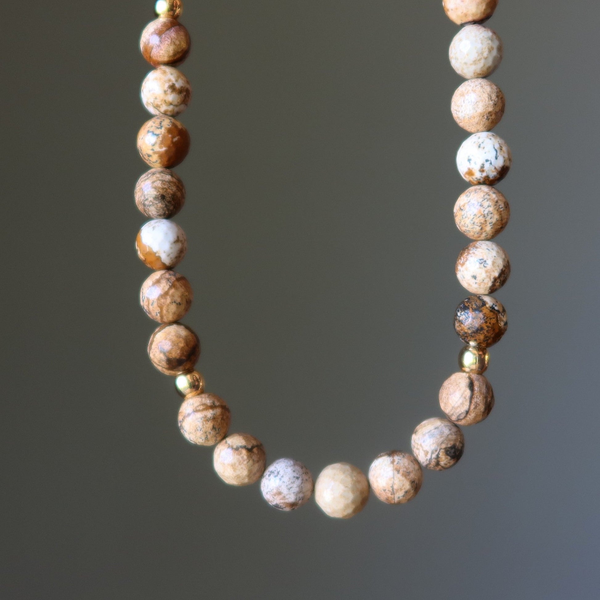 Your new necklace features a natural and untreated Landscape Jasper. The faceted brown stones show unique patterns and are strung with gold-plated beads secured with a toggle clasp. Each stone is unique. Beaded in the Satin Crystals studio in the USA.