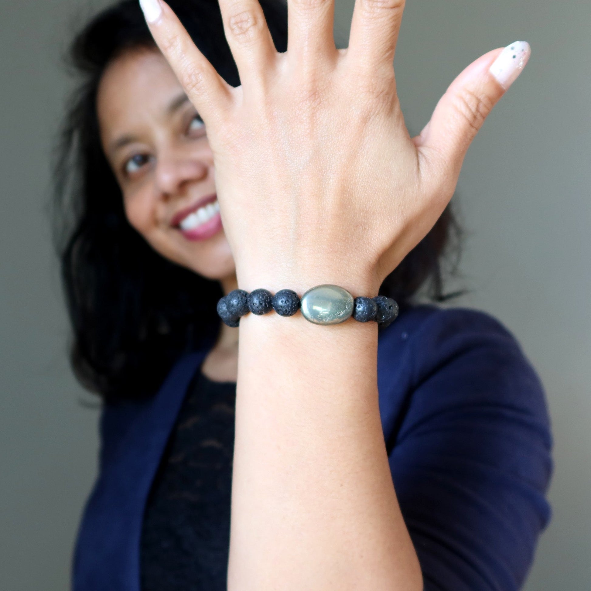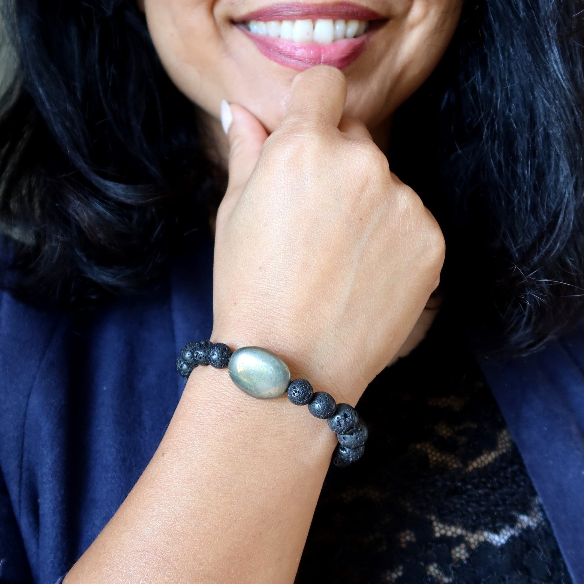 Your bracelet showcases natural and untreated Lava and Pyrite on sturdy elastic stretch cords. The Lava is a porous, black stone. The Pyrite is a golden oval. Each stone differs. Beaded in the Satin Crystals studio in the USA.