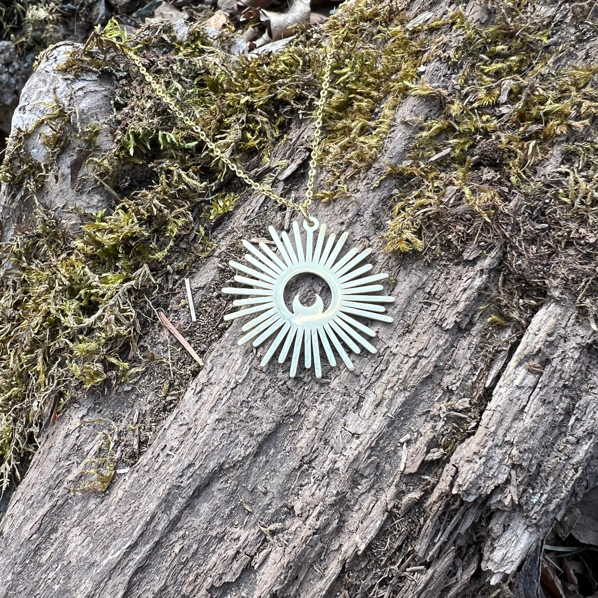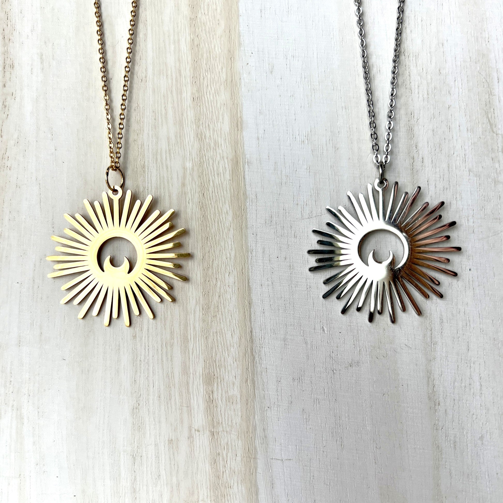 Channel the powerful energy of cosmic wonder with our Lunar Nova Necklace from The Lunar Wisdom Collection. This bold 40mm pendant features a crescent moon surrounded by dramatic celestial rays, creating a stunning starburst effect that captures the magic of a moonlit sky.