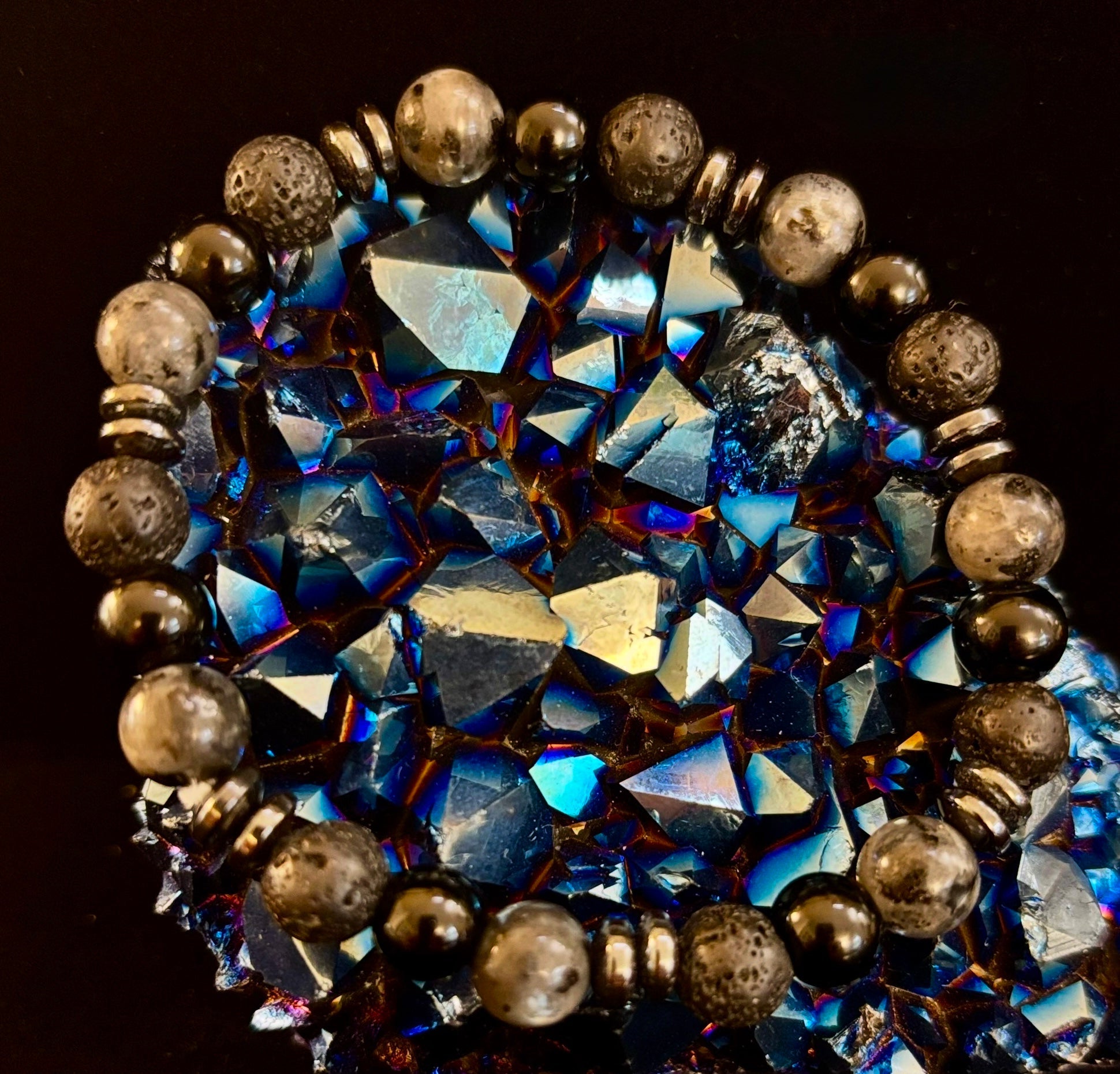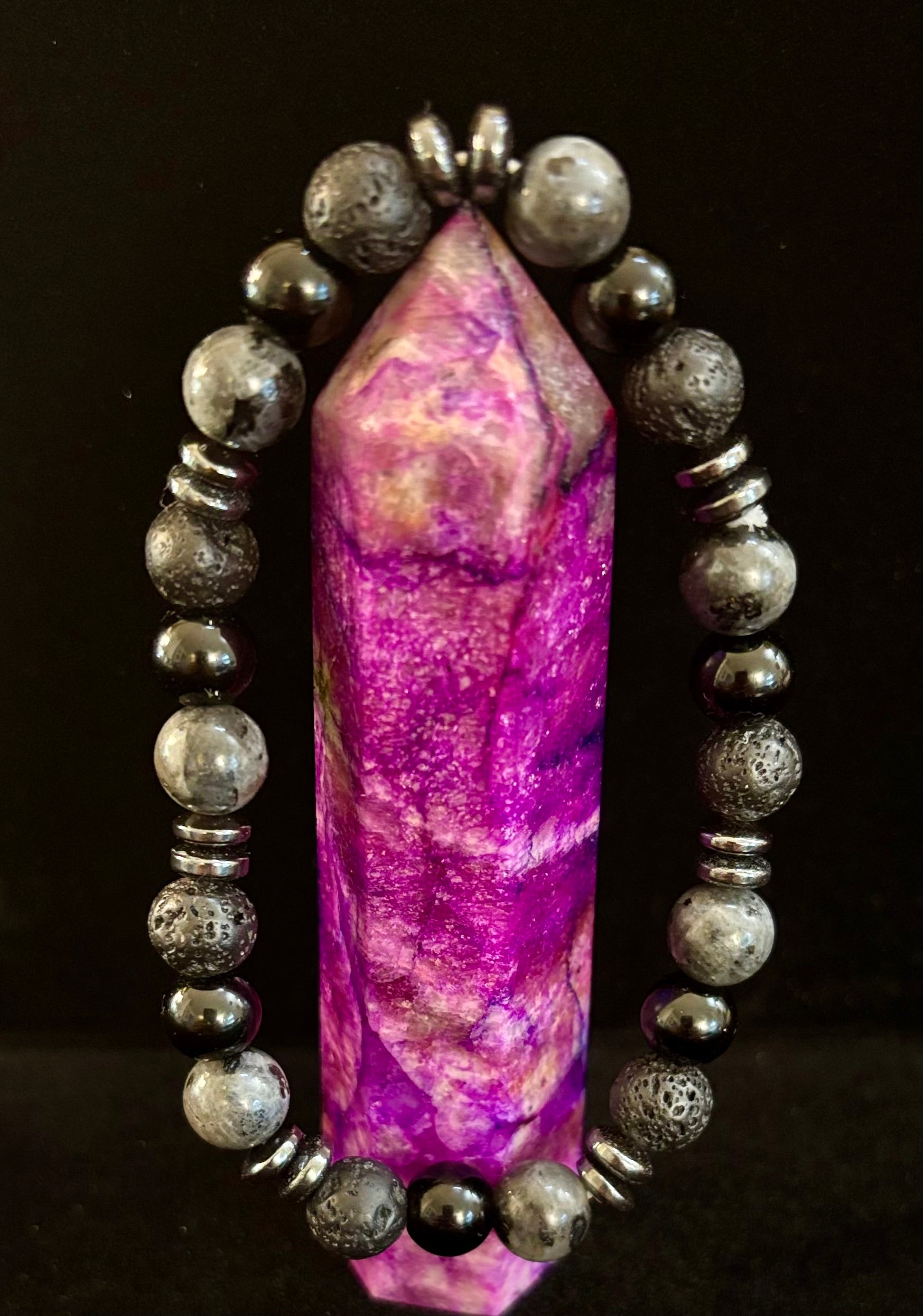 Channel mystery, strength, and grounded energy with our Mystic Warrior Bracelet, designed especially for larger wrists. Featuring a captivating combination of Labradorite, Black Onyx, and Lava Rock, this bracelet is accented with matte black metal spacers for a sleek and masculine finish.