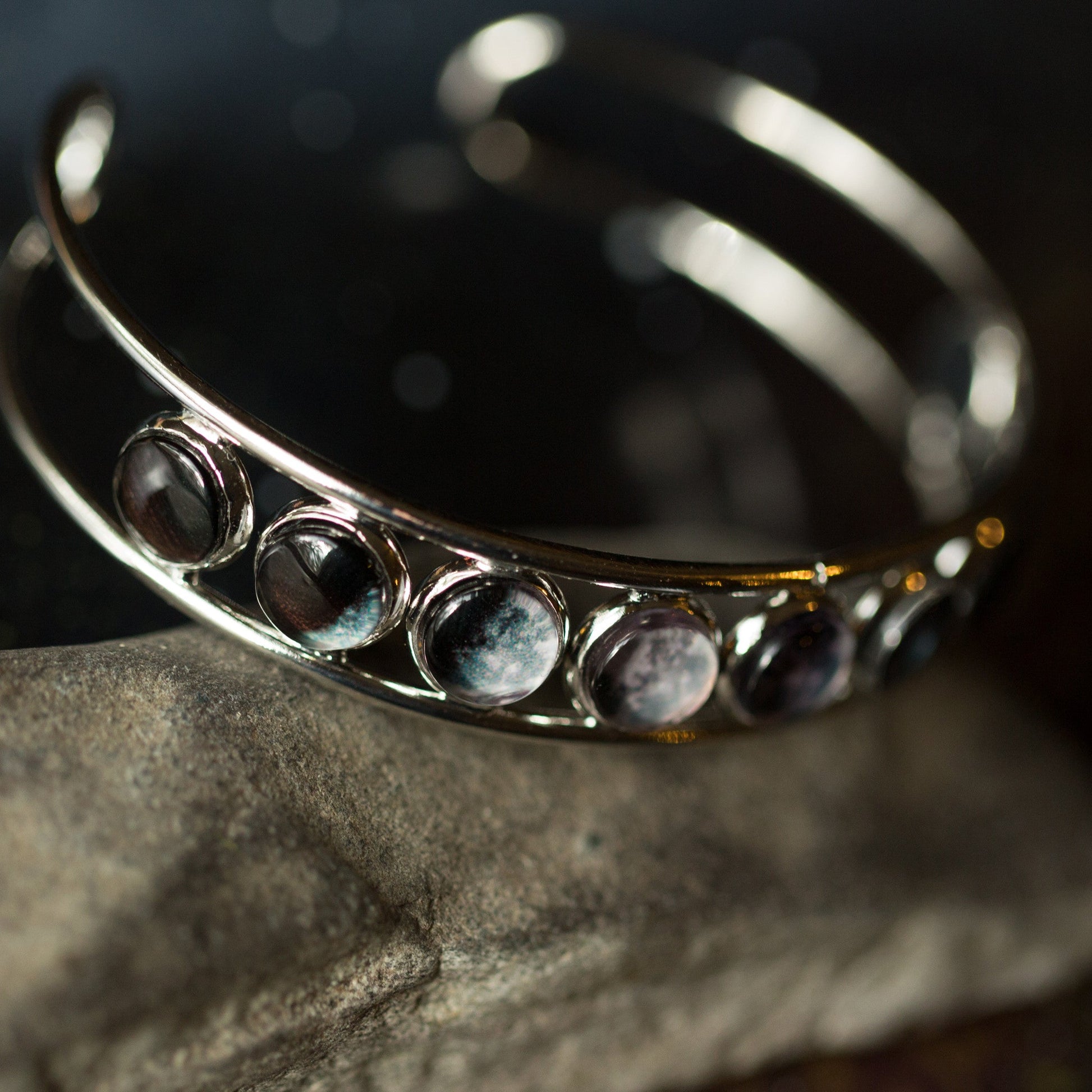 Have you ever wanted our beautiful lunar sister and her many faces hanging about your wrist? In this beautiful and simple cuff bracelet, you can do just that. A lunar celebration, this Moon phase cuff is a simple but unique statement piece. With our design, you get 9 phases of the Moon on an adjustable bracelet. A wonderful gift for a person passionate about astronomy, astrology, science, meditation, wicca, or general new age fashion.