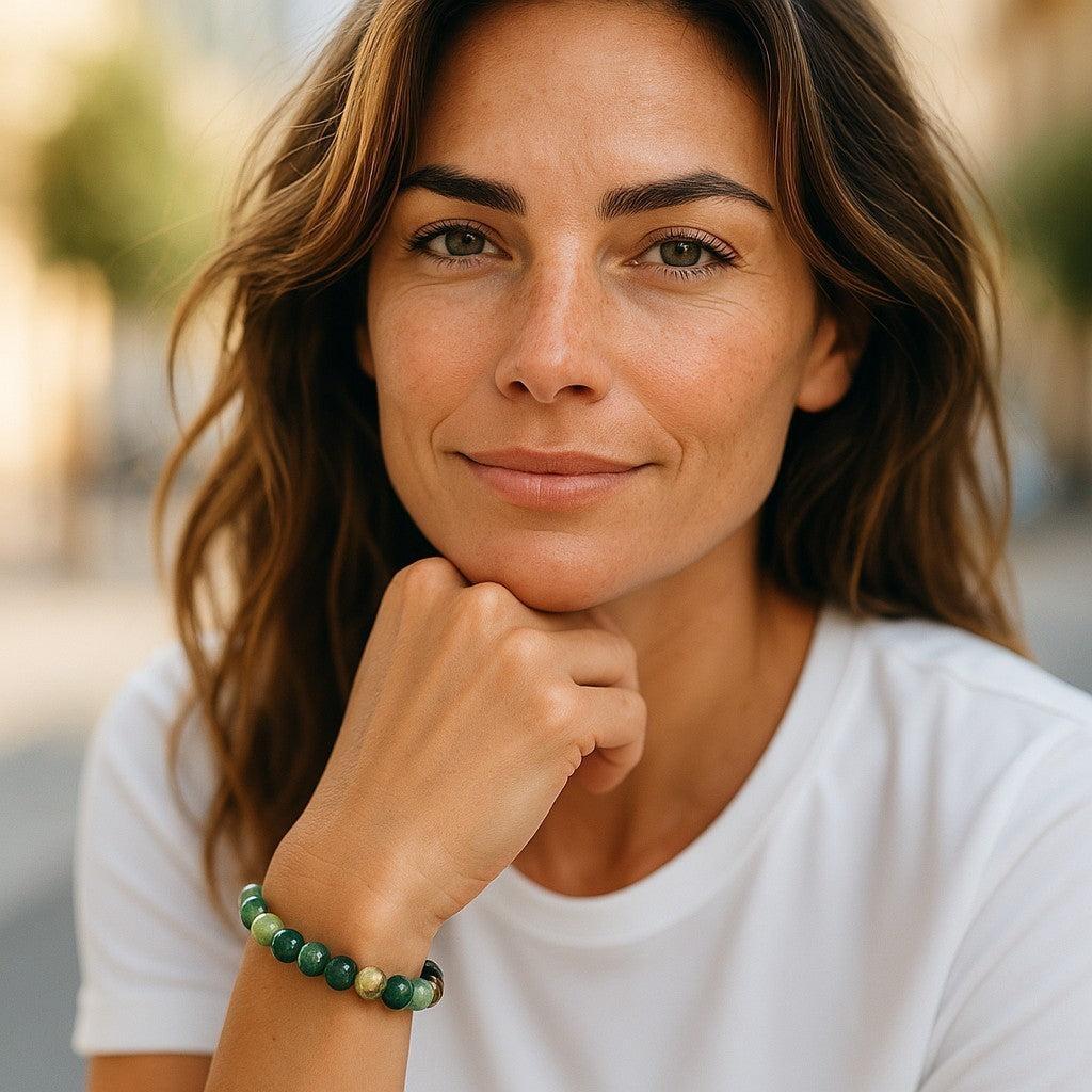 Moss agate is known for its grounding, calming, and stabilizing properties. Wearing this bracelet promotes emotional balance, growth, and a connection to nature, making it both a stylish and energetically meaningful accessory.