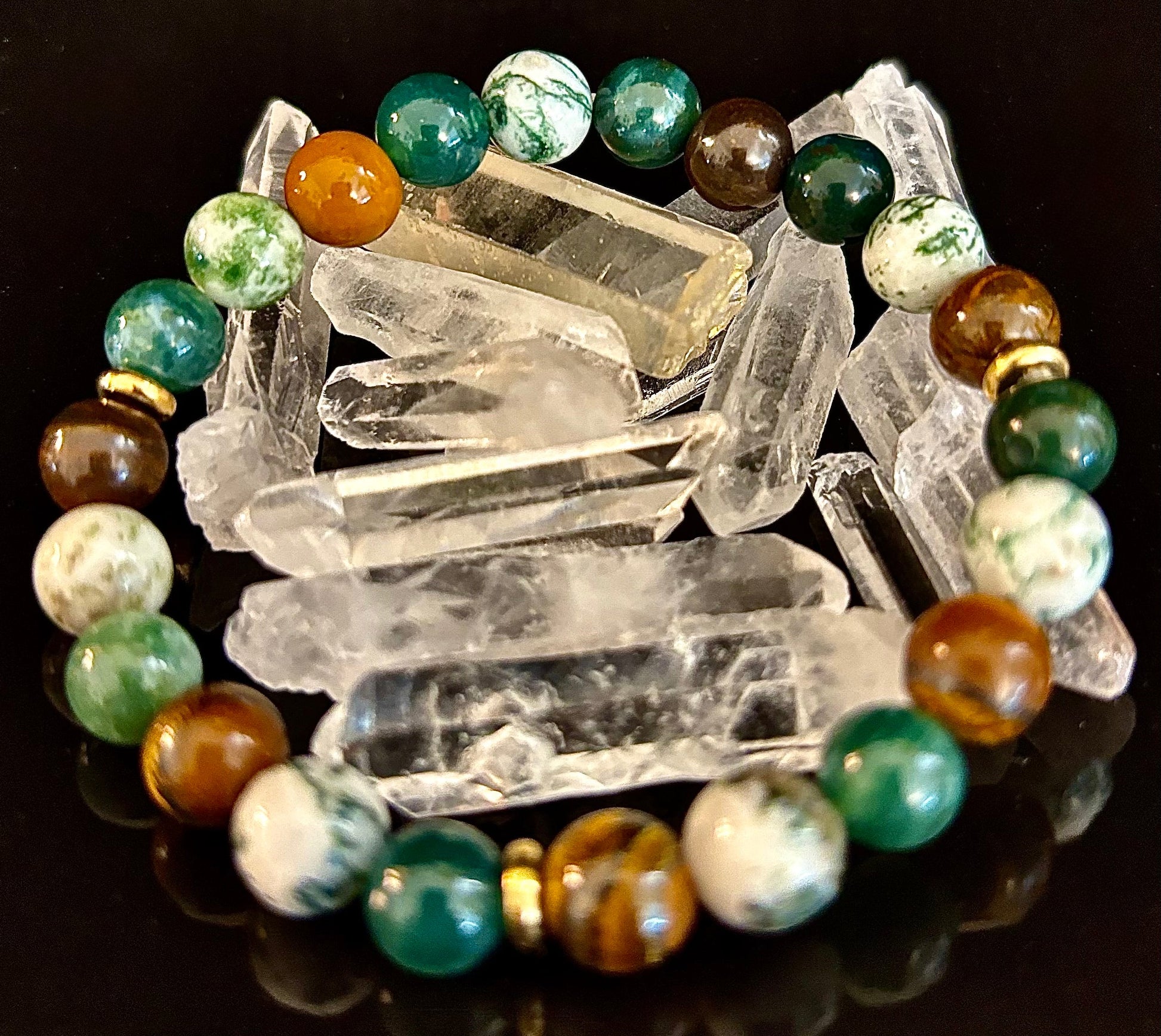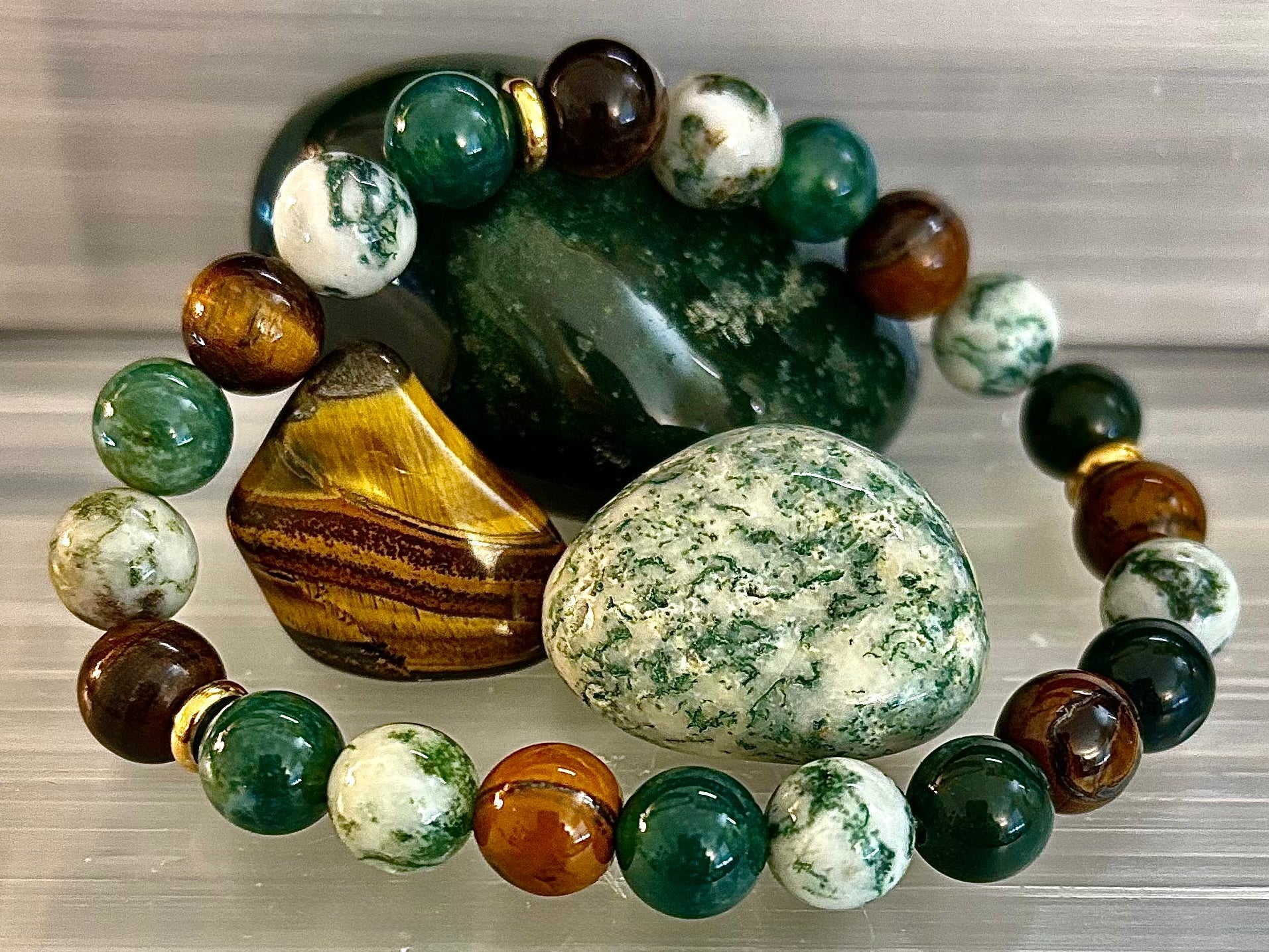 Moss Agate & Tiger Eye Gemstone Bracelet – 8mm Beads for Strength, Healing & Protection