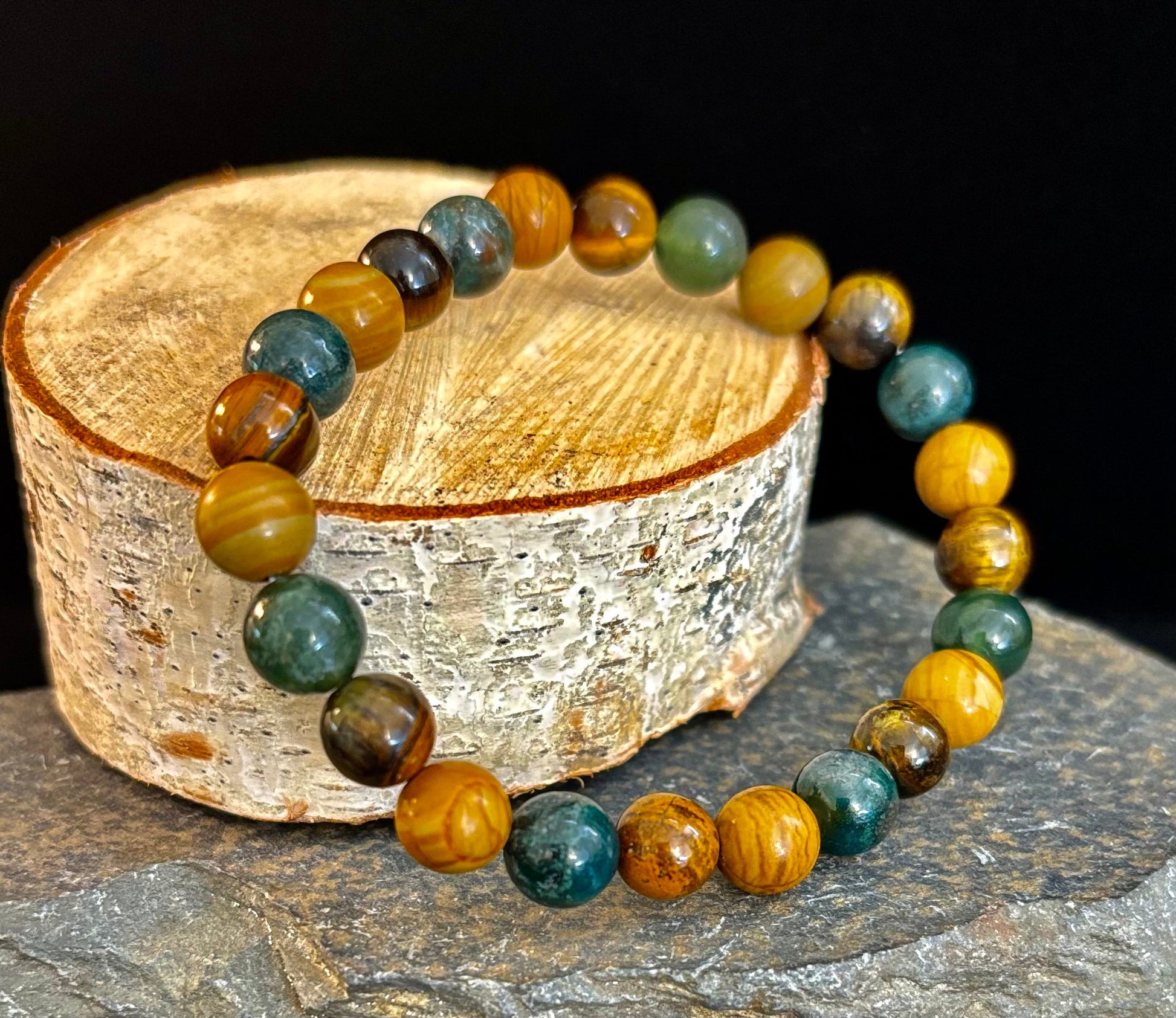 Moss Agate, Yellow Tiger Eye & Wood Jasper Bracelet – 8mm Beads for Large Wrists