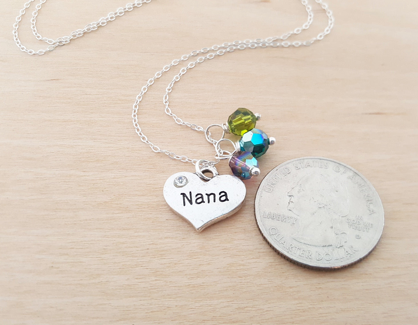 This necklace is handcrafted featuring a silver Nana heart charm, adorned by 1 - 4 Swarovski crystal birthstone charms, wire wrapped tightly by hand. Attached to a fine Sterling silver cable chain, made to your specified length.