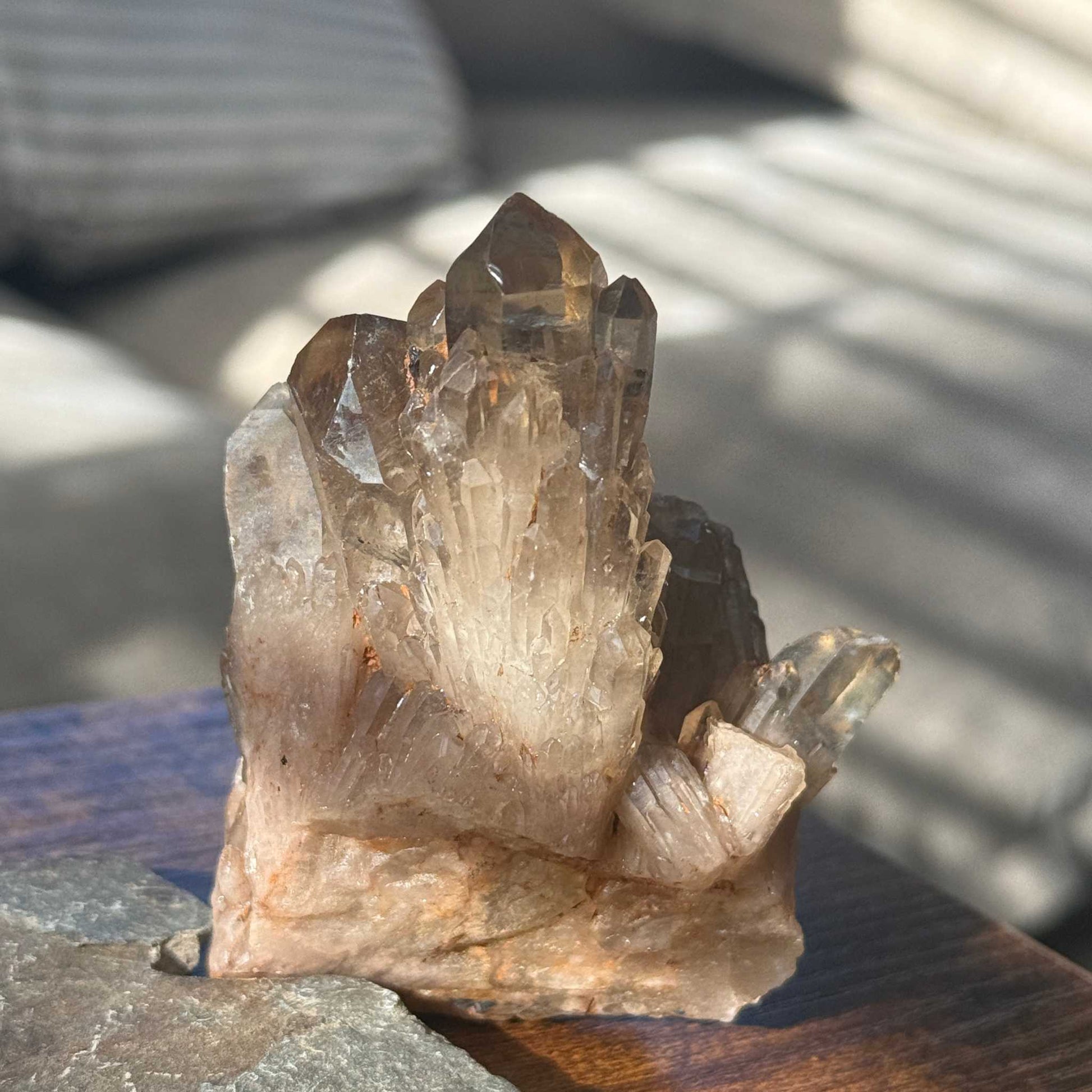 This natural Kundalini Citrine from the Democratic Republic of Congo embodies strength, elevation, and spiritual growth. Weighing 163.2 g (0.36 lbs) and measuring 3.5 inches tall, 2.5 inches wide, and 1.5 inches deep, this Summit Cluster features three main crystal points rising in unison, resembling the peaks of a sacred mountain.