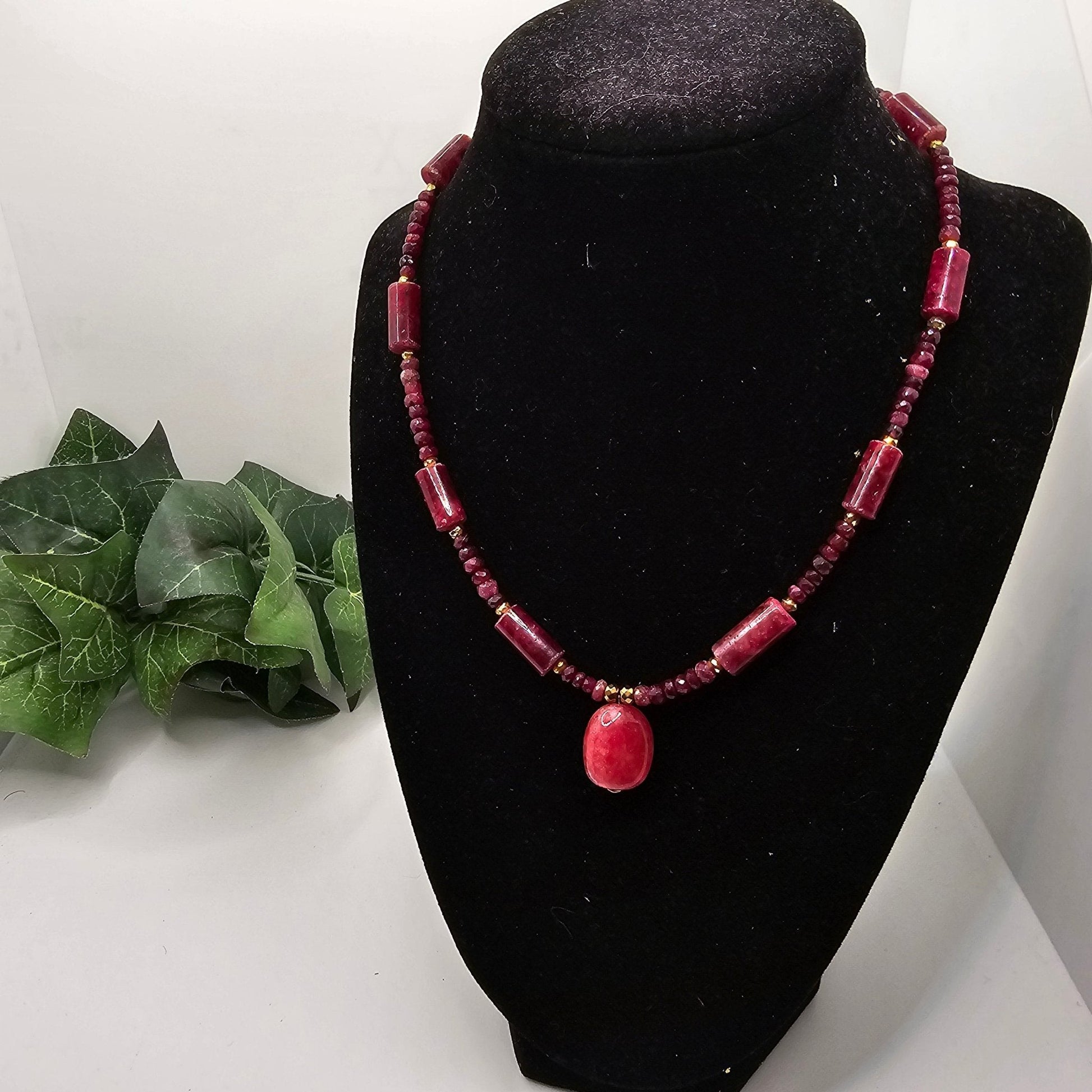 Enhance your neckline with this exquisite choker necklace featuring natural ruby tubes, 18k gold brushed hematite, and faceted rondelle ruby stones. The centerpiece is a stunning natural ruby stone pendant. It can also be worn solo for a more minimalistic look. The necklace features high-quality, genuine natural ruby stones and is crafted with care, making it a great fashion accessory for any outfit. Its versatile design allows you to style it in multiple ways, whether you prefer a bold statement or a more subtle look.