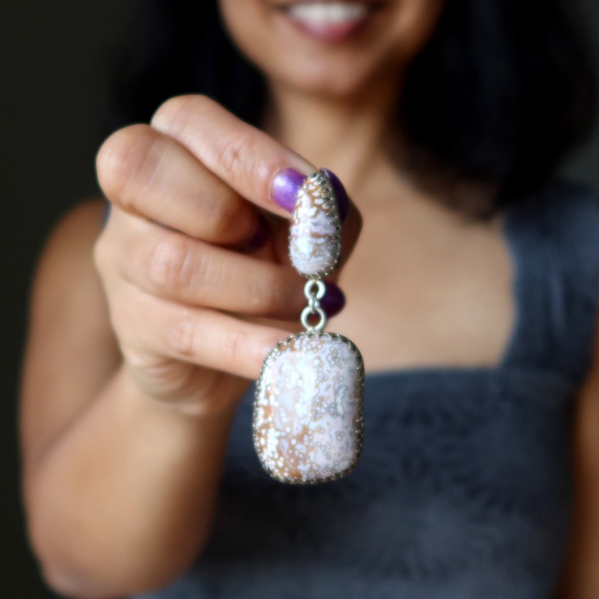 This energetic Ocean Jasper pendant is a double delight, featuring two gorgeous stones set in sterling silver. You wear the energy of the sea in style!
