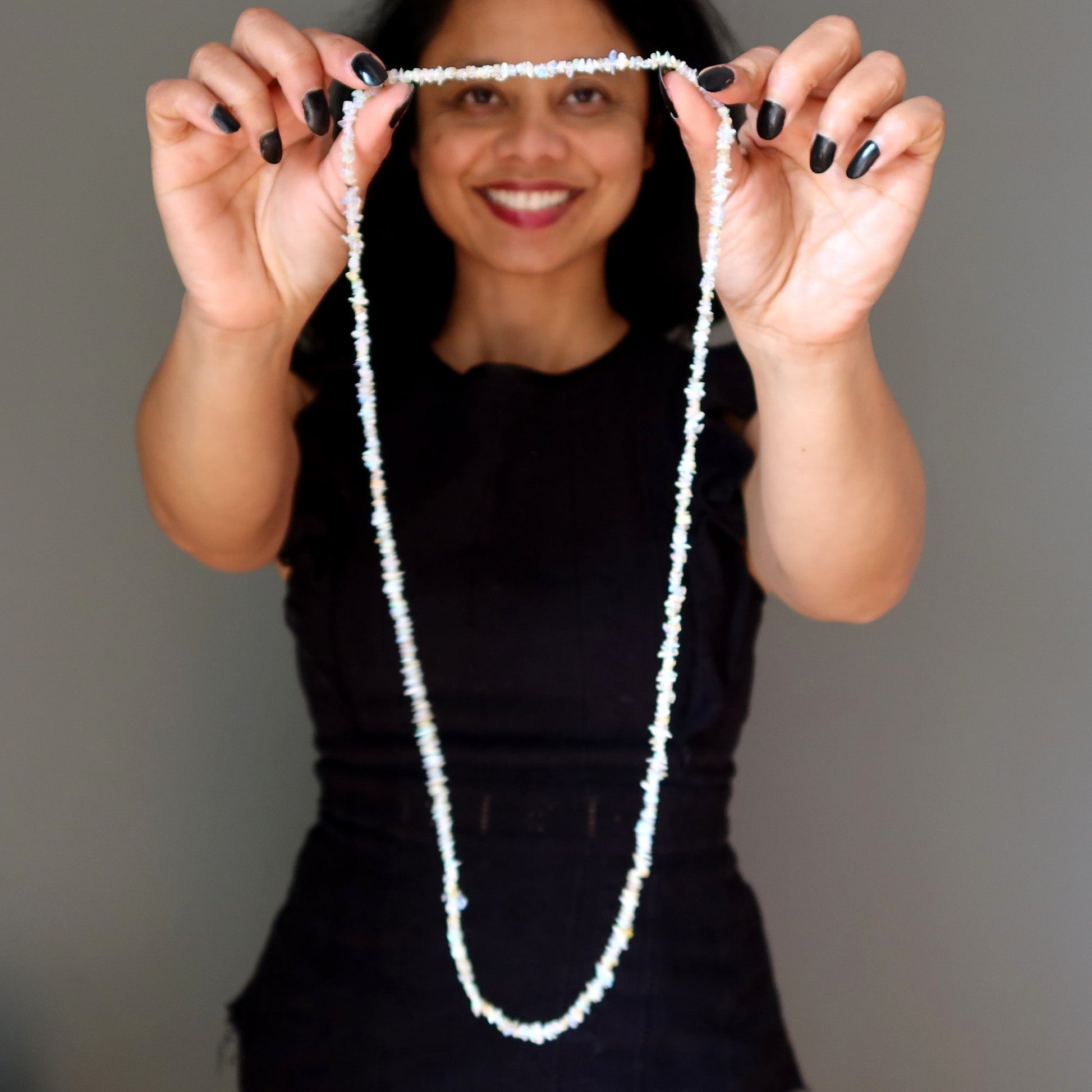 Your new necklace is beaded with natural Opals. This is a translucent yellow gemstone with rainbow flashes on a strand that can fit over the head without a clasp. Each stone is unique.