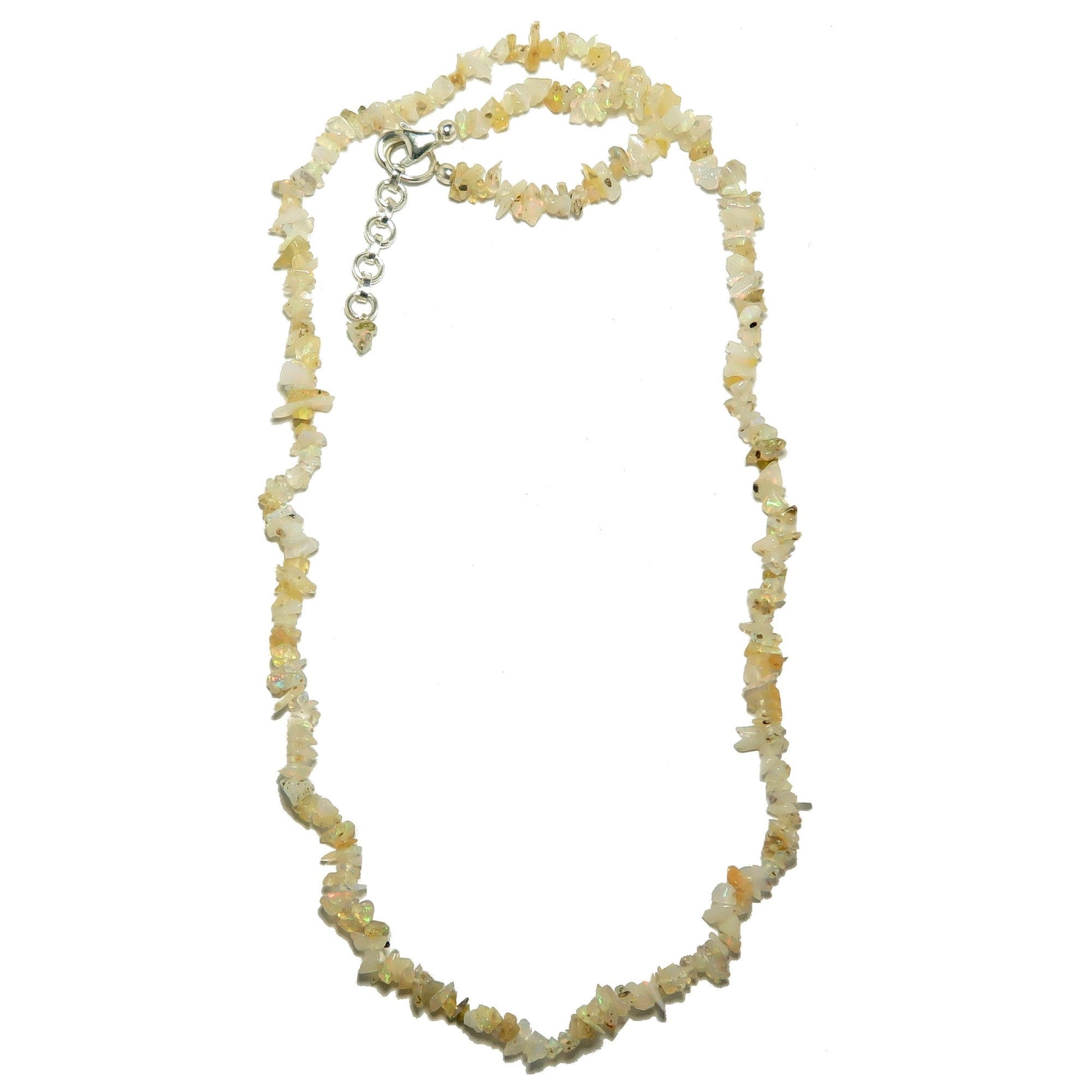Your new necklace is beaded with natural Opals. This is a translucent yellow gemstone with rainbow flashes strung with a sterling silver lobster claw clasp. Each stone is unique.