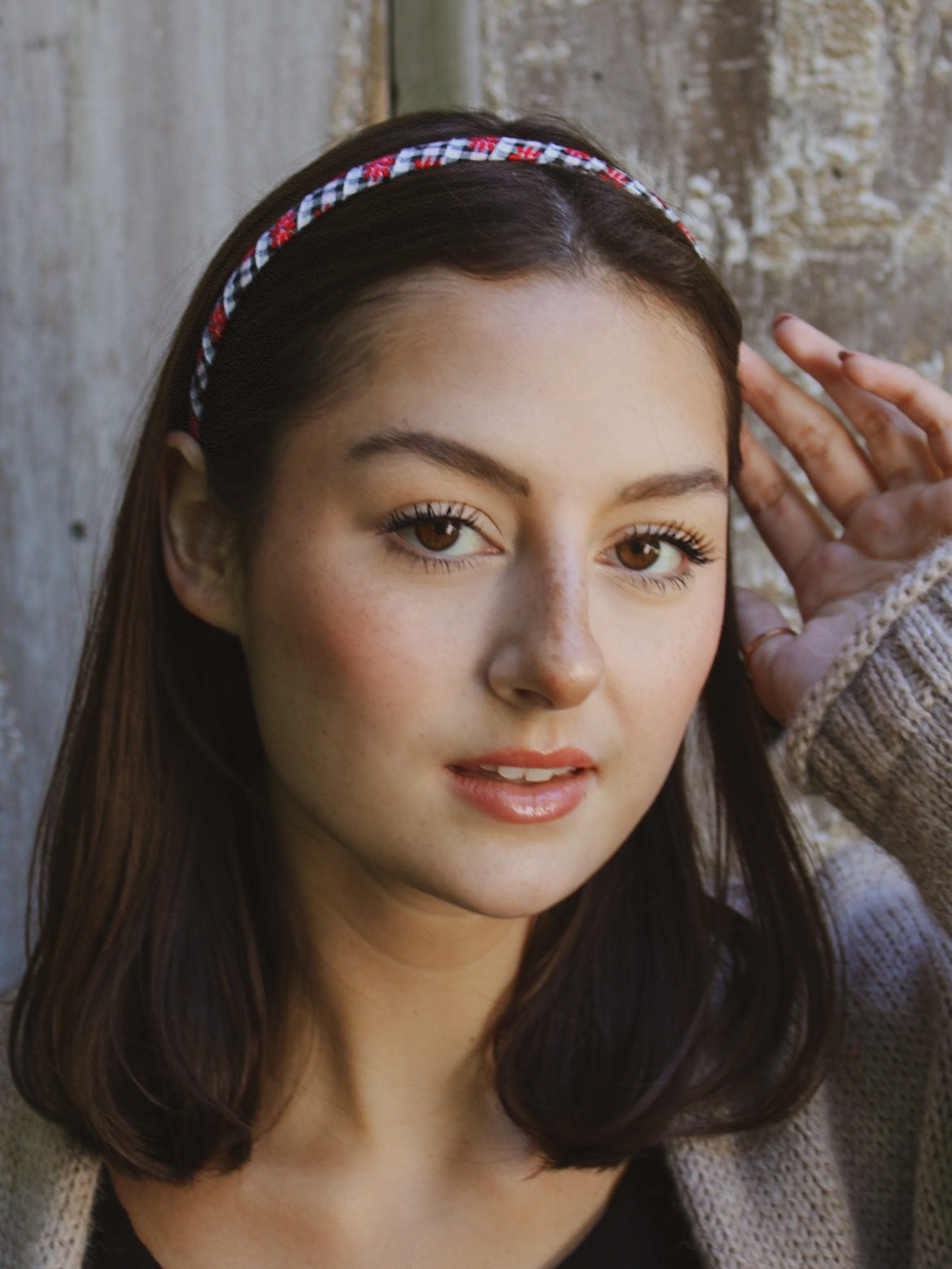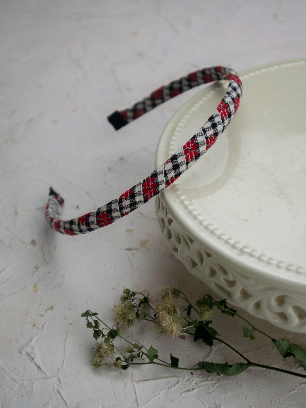 This sweet slim headband is wrapped in vintage gingham ribbon in black and white with red floral embroidery. It's the perfect preppy finishing touch to your look.