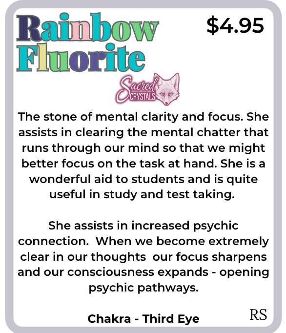 Rainbow Fluorite is said to clear mental chatter, sharpen concentration, and restore order to a busy mind. Often used by students or those learning new skills, it enhances retention and mental stamina. As the mind becomes clear, intuitive pathways open—expanding psychic connection and deepening spiritual awareness.
