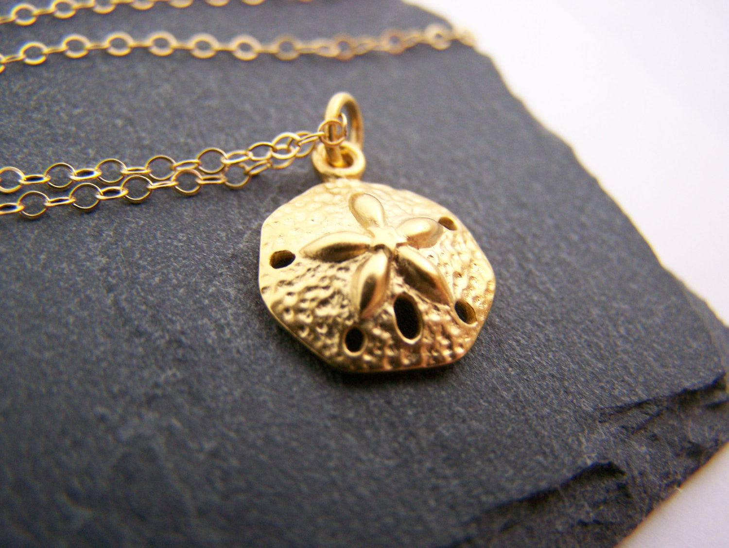 This dainty necklace is handcrafted featuring a detailed Sand Dollar charm attached to a delicate 18 inch, 14k gold filled cable chain with clasp. Necklace comes on a beautiful insert card, printed on high quality 110lb card stock.