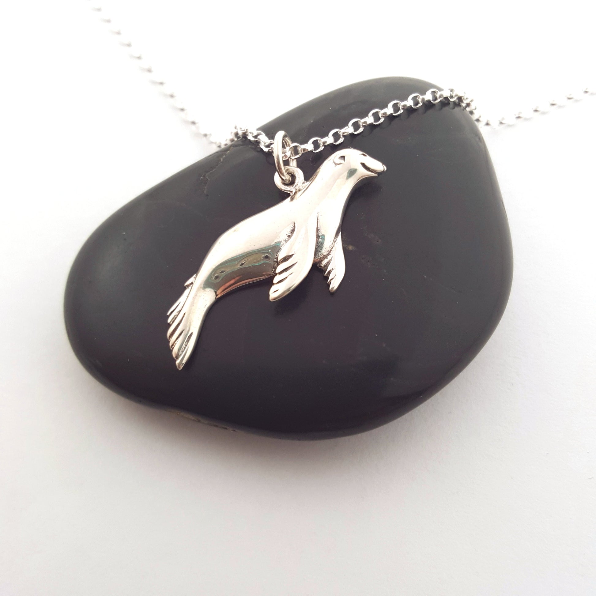 This dainty necklace is handcrafted featuring an detailed Sterling silver Sea Lion charm attached to a delicate 18 inch, Sterling Silver cable chain with clasp. Pendant measures 16 x 27mm. Necklace comes on a beautiful insert card, printed on high quality 110lb card stock.