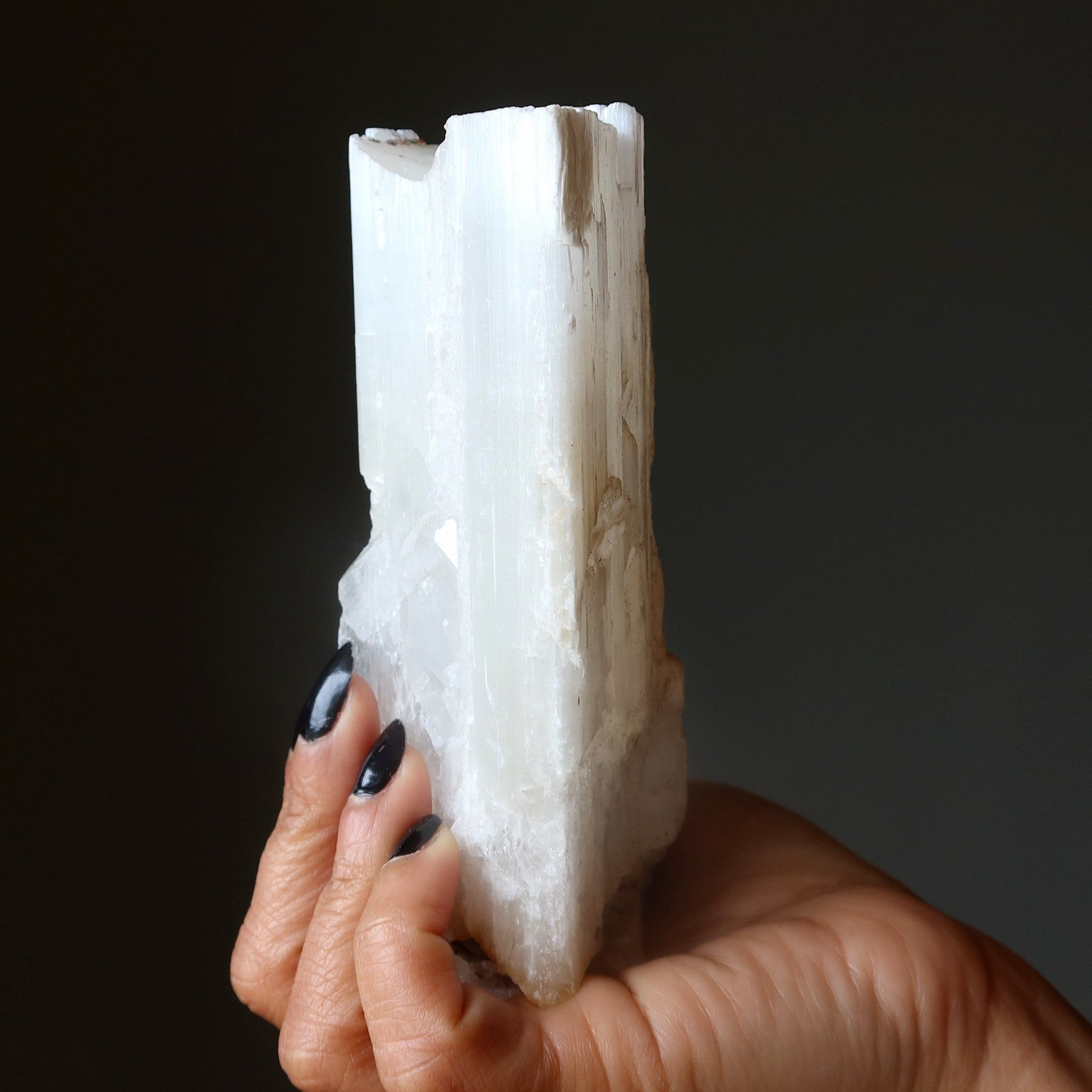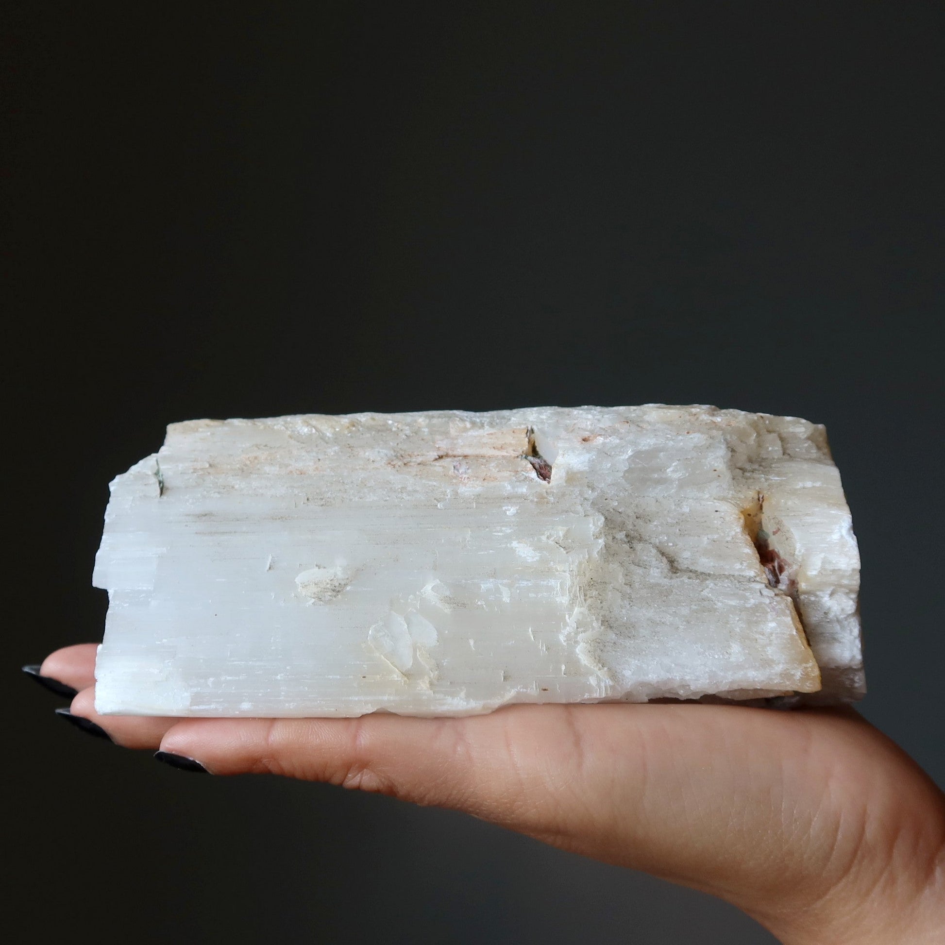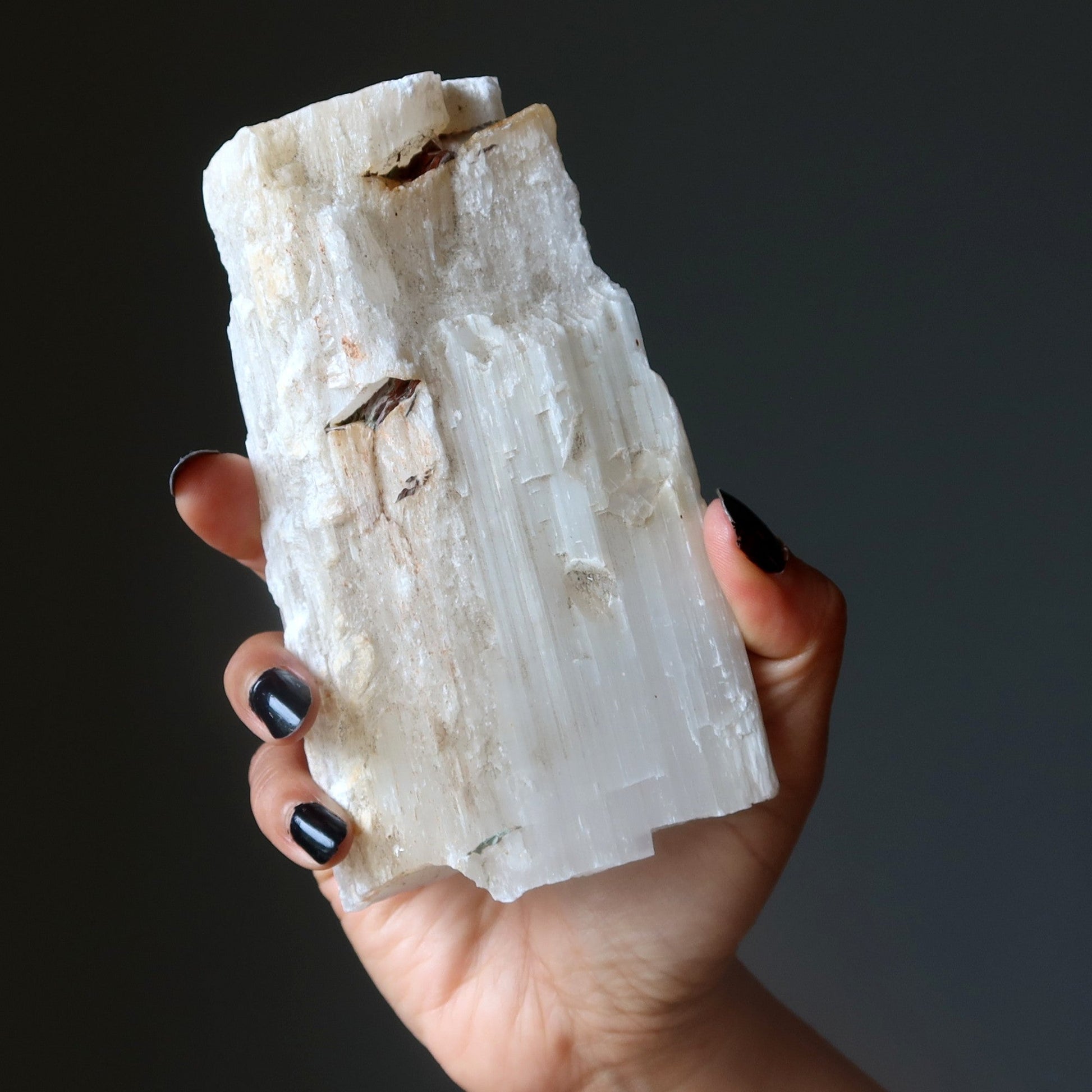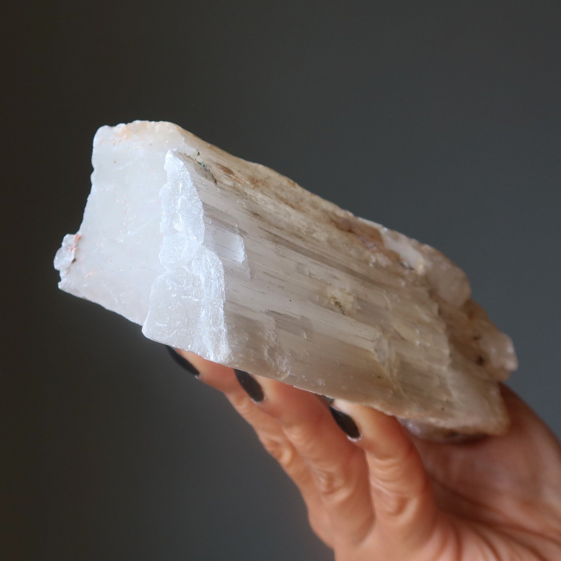 Your new stone is an untreated log of white Satin Spar Selenite. FRAGILE STONE - WILL FLAKE - HANDLE WITH CARE. Each stone is unique.