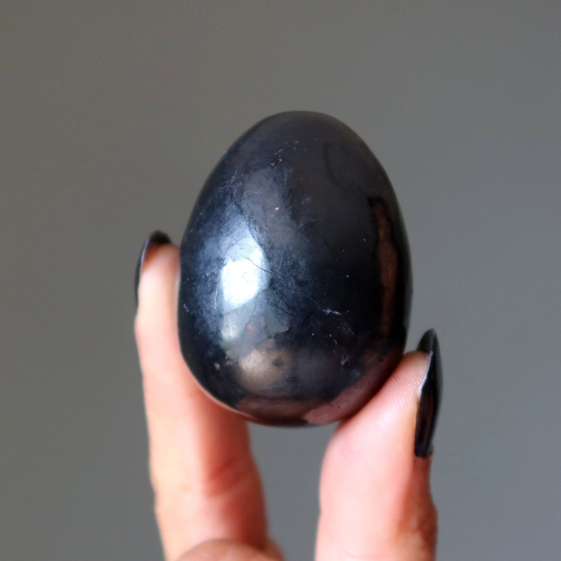Your new egg is hand-polished from natural and untreated black Shungite from Shunga village in Karelia, Russia. Each stone differs; retaining natural pits, grooves, and inclusions.