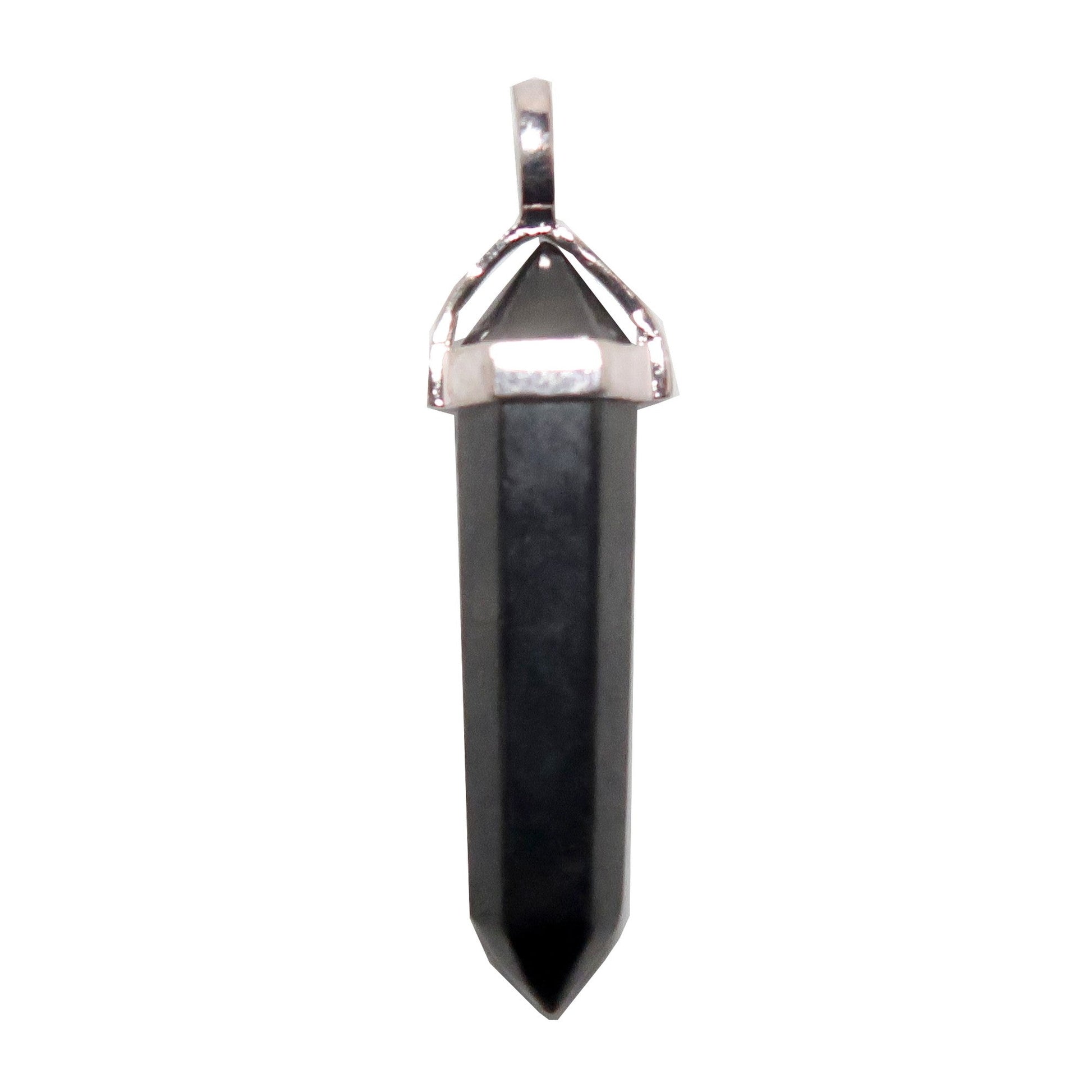 Your new pendant features a natural and untreated Shungite from Russia. This is a black stone faceted and double terminated, set in a silver-tone bail.