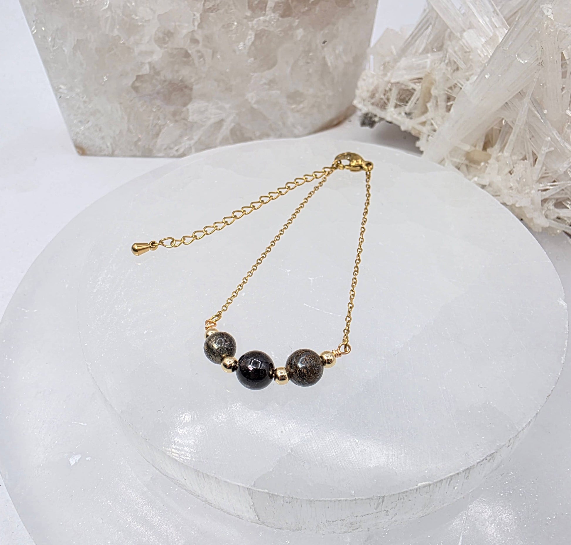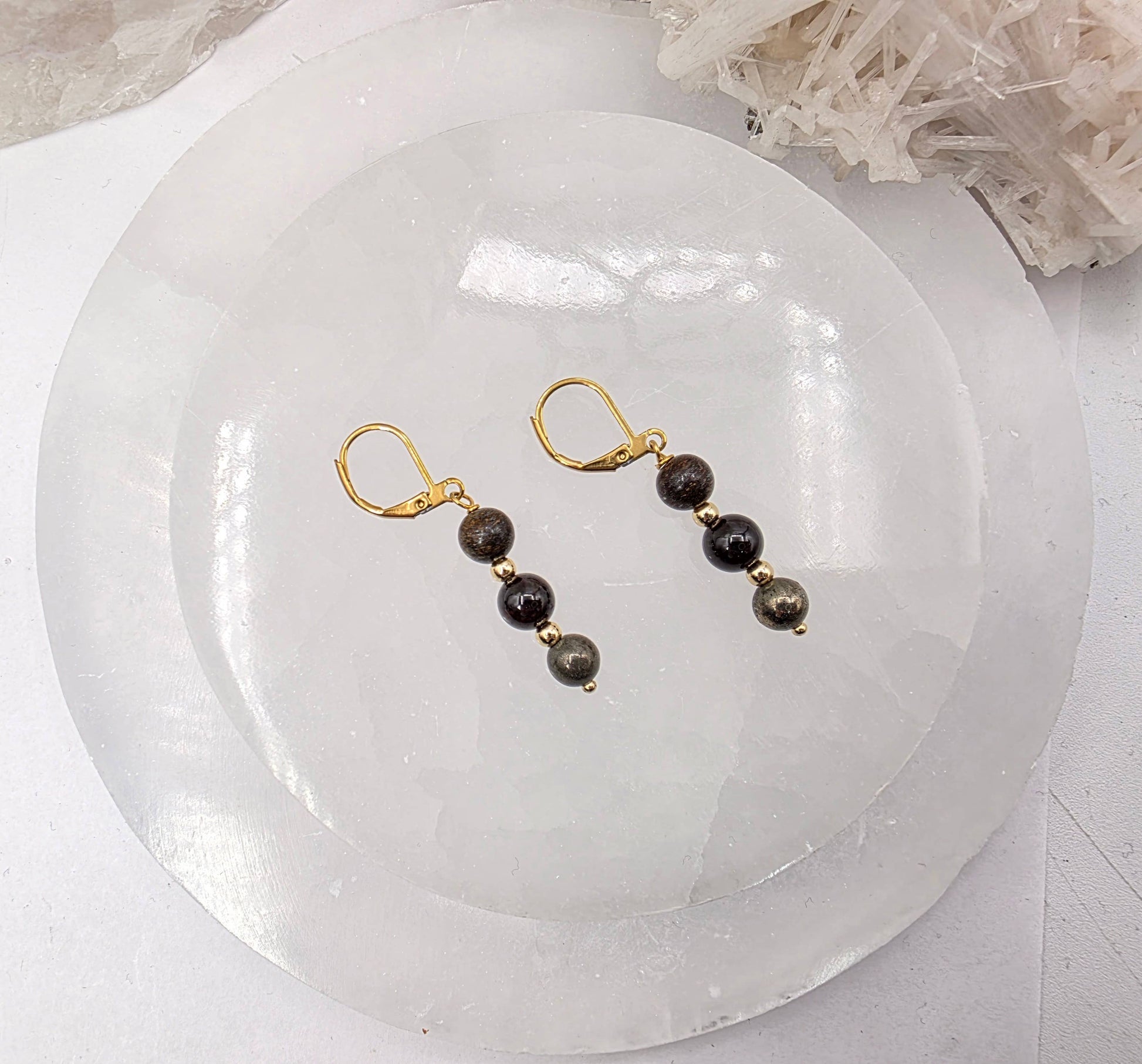 This coordinated gemstone set harnesses the grounding and protective properties of Pyrite, Bronzite, and Garnet to cultivate personal authority and resilience. Crafted from nickel-free Stainless Steel or 18kt. Gold-plated Stainless Steel, the collection pairs three complementary pieces—bracelet, necklace, and earrings—to reinforce your intention of standing firm in your truth. Pyrite activates confidence and willpower, Bronzite anchors clarity in decision-making, and Garnet ignites courage and vitality. Whether worn as a complete set for unified energetic support or as individual pieces, this jewelry collection is designed for those seeking meaningful gemstone accessories that align with their commitment to personal strength and unwavering boundaries. COMES WITH GIFT BOX. (Gift Boxes are assorted colors)
