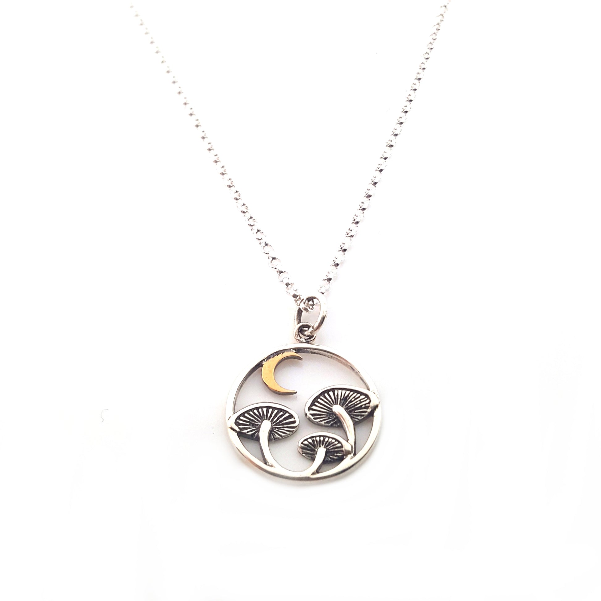 With a detailed silver mushroom and a tiny bronze crescent moon charm, this necklace brings together grounding earth and dreamy night sky energy. Layer it, gift it, or wear it as your everyday good-luck talisman.
