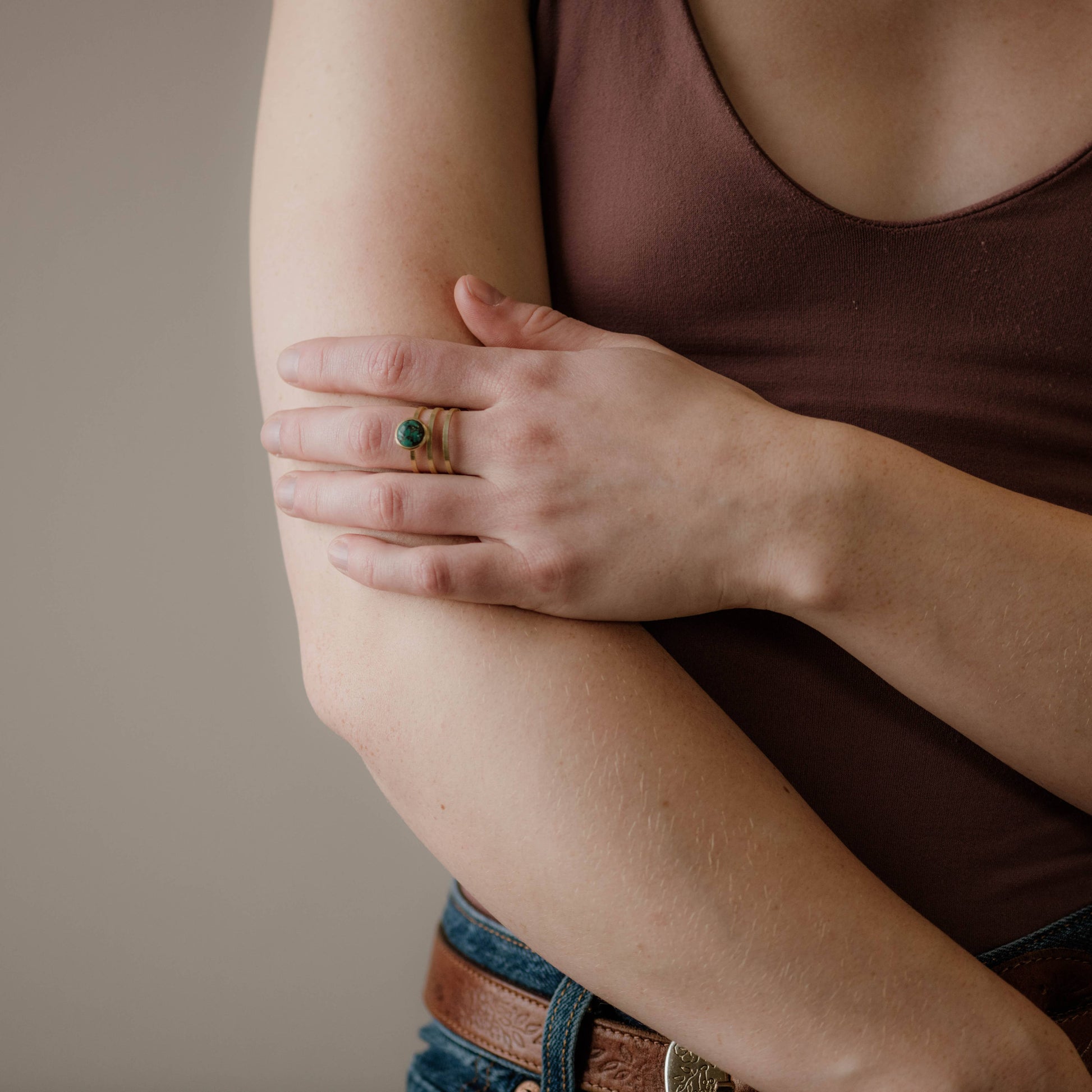 Adjustable brass band with a genuine 8mm bezel set stone.